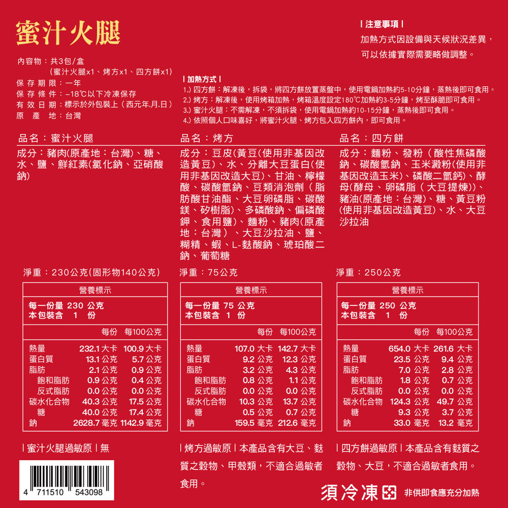 商品重(容)量:御品鮑魚佛跳牆-2500g(固形物1100g);干貝臘味米糕-1000g;金沙海鮮煲-1000g(固形物350g);蜜汁火腿