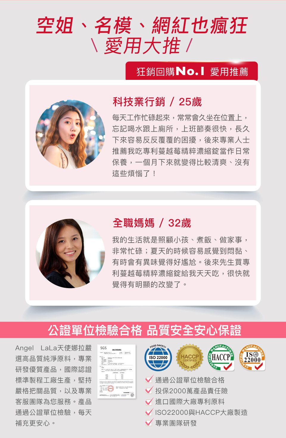 | 商品規格 | 品 名:Angel LaLa 天使娜拉 淨密舒專利蔓越莓精萃濃縮錠 |