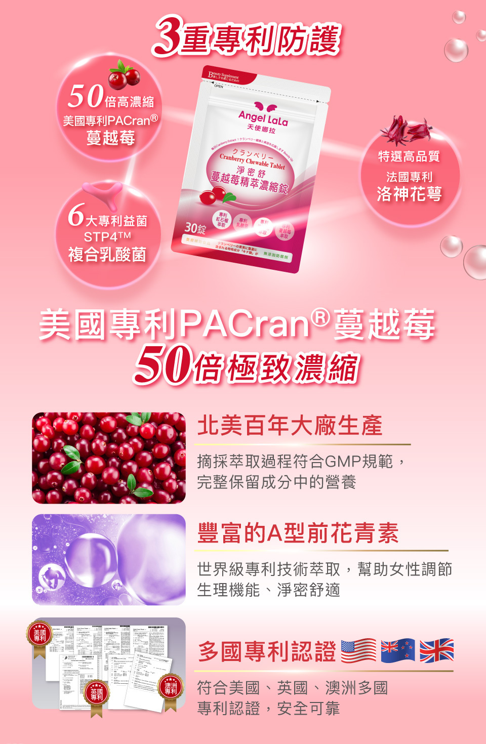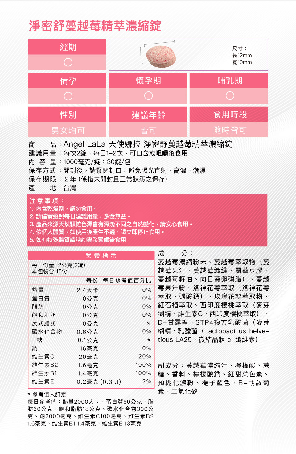 | 商品規格 | 品 名:Angel LaLa 天使娜拉 淨密舒專利蔓越莓精萃濃縮錠 |