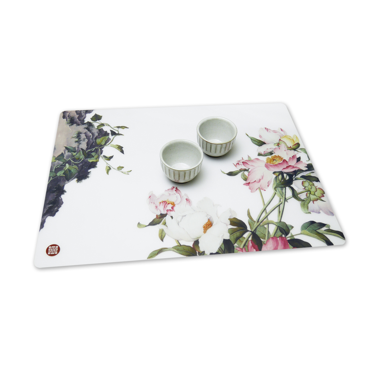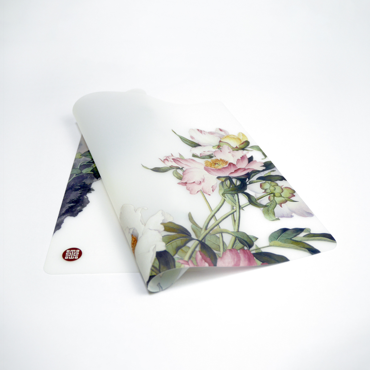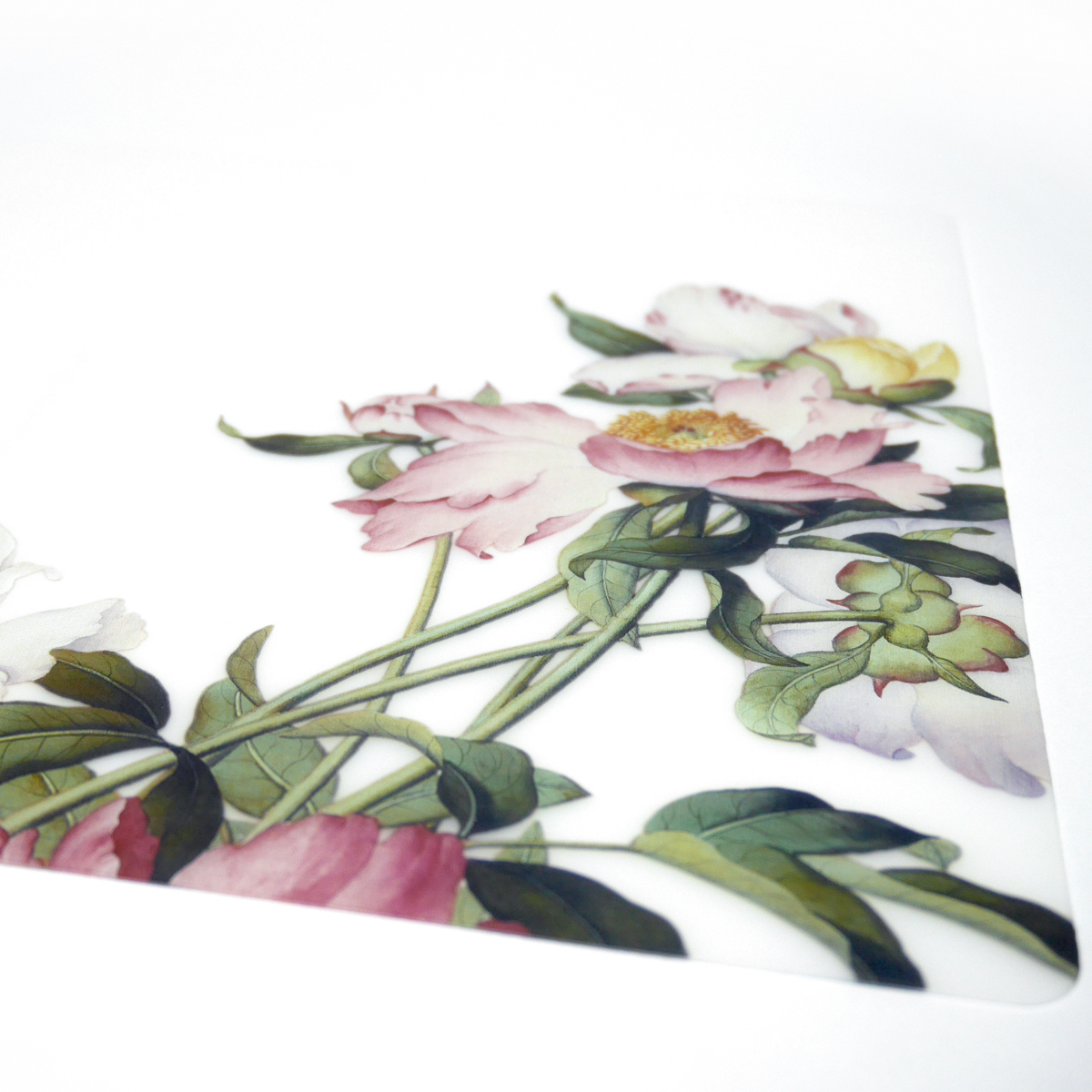 郎世寧的花鳥作品豐富,用色精緻鮮麗。此次取材自其作<芍藥>呈現出華麗風格的餐墊。