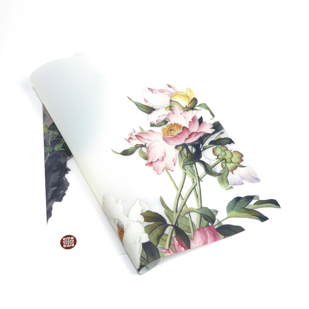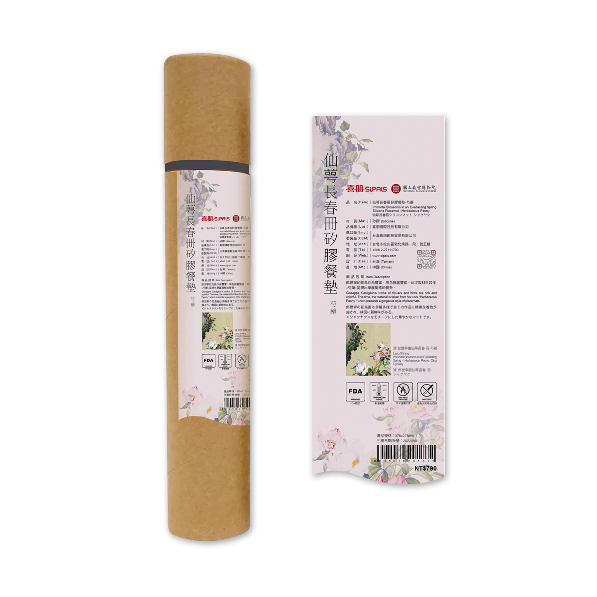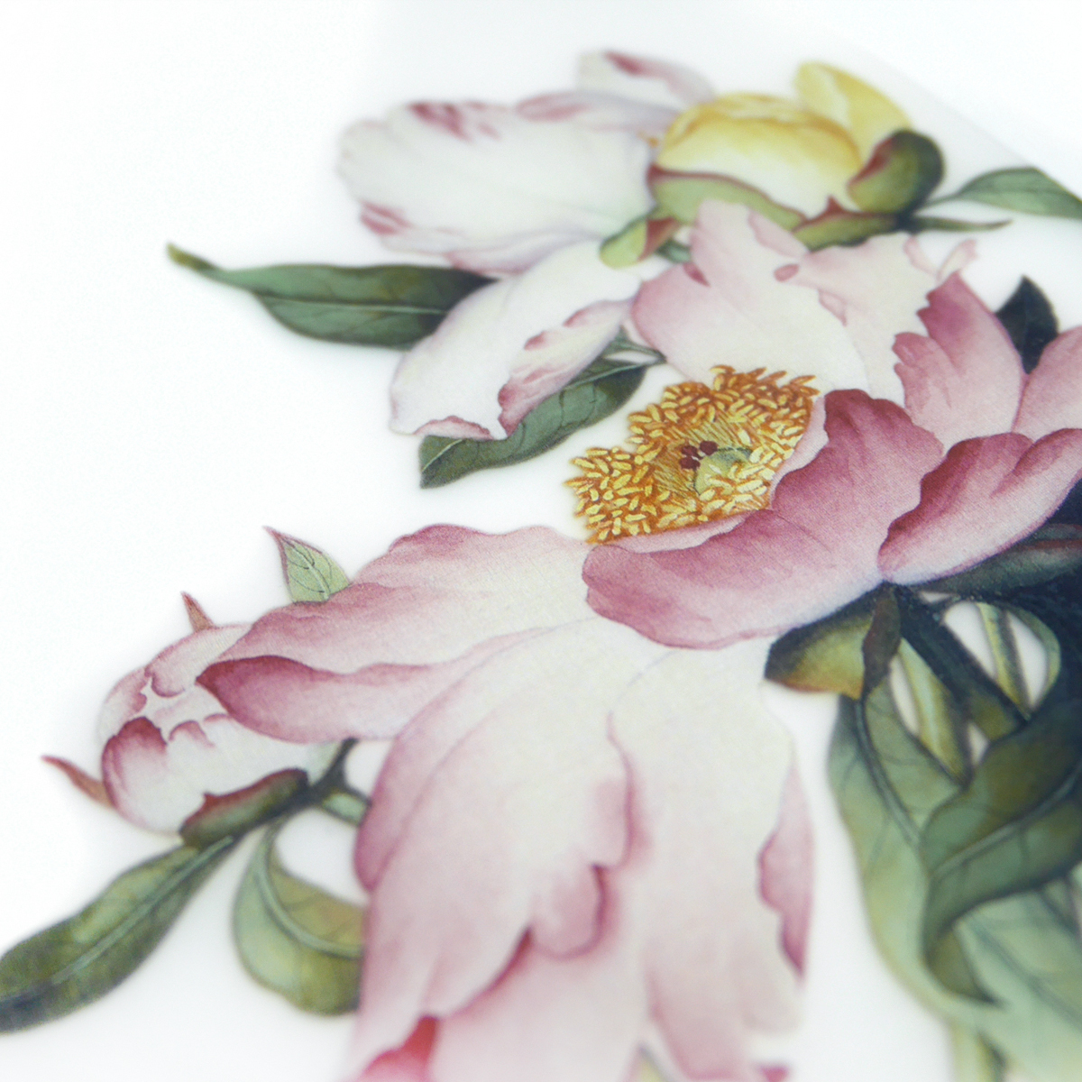 郎世寧的花鳥作品豐富,用色精緻鮮麗。此次取材自其作<芍藥>呈現出華麗風格的餐墊。