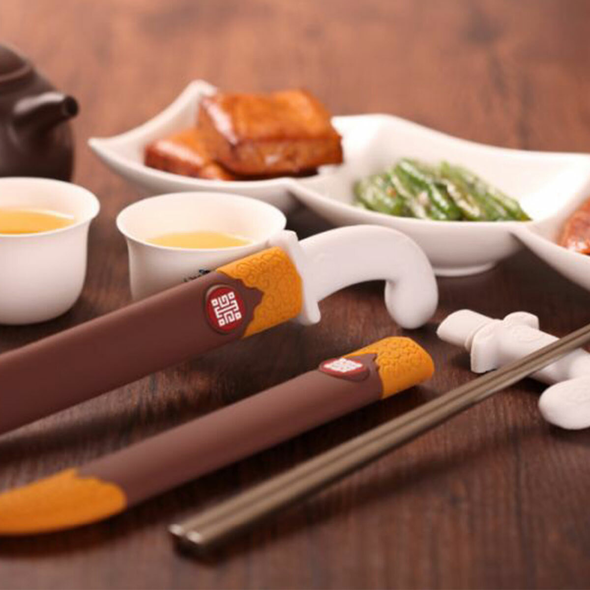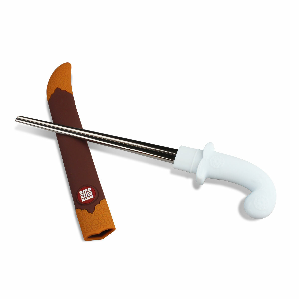 "箸,亦曰筷,進食之器也。乃中國從古沿襲至今意用多工的餐具代表。其成雙成對的意象在東方傳統習俗中亦被視為吉祥之象徵,常做為送禮傳情之物。取中國經典兵器造型為環保筷套設計,趣味的拔取使用體驗與精美的紋飾點綴,重現如古代俠士隨身佩件般瀟灑姿態。"