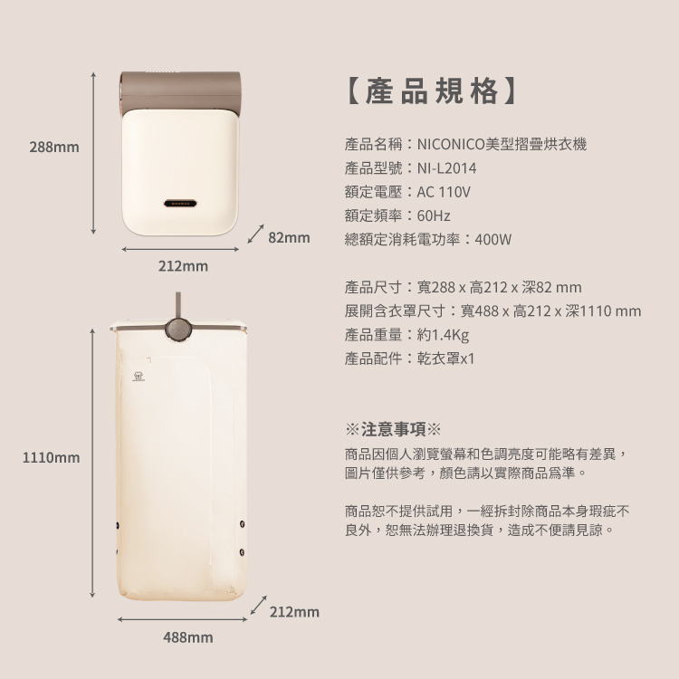商品名稱:NICONICO美型摺疊烘衣機NI-L2014 (乳酪色)