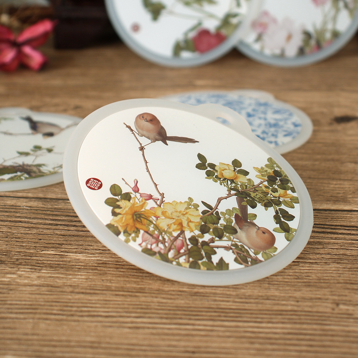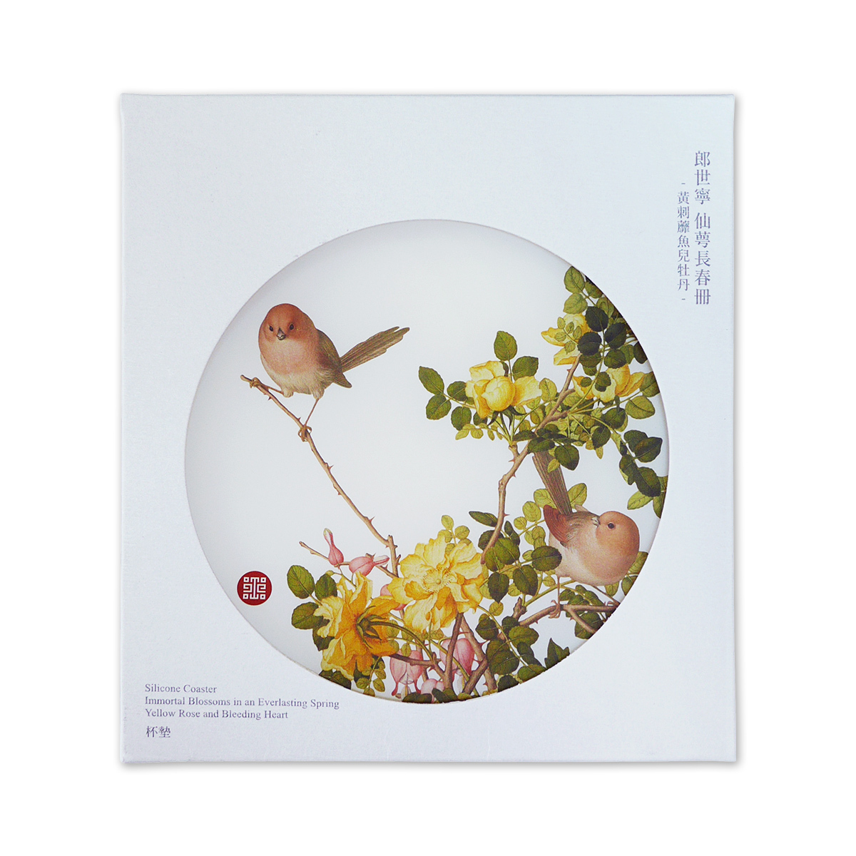 本商品創意來自於國立故宮博物院「清郎世寧畫仙萼長春 冊 黃刺蘼魚兒牡丹」。取其做成矽膠杯墊,將此經典作品融入現代的日常生活中。