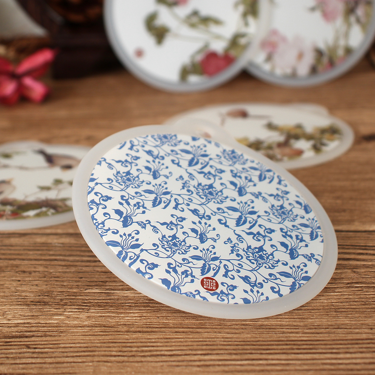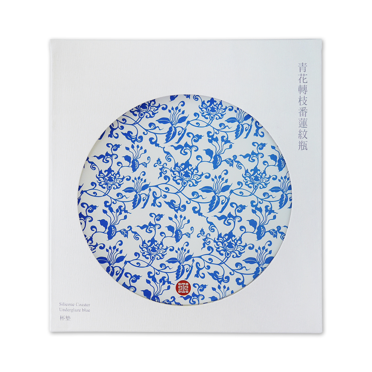 本商品創意來自於國立故宮博物院「青花轉枝番蓮紋瓶」。取其做成矽膠杯墊,將此經典作品融入現代的日常生活中。