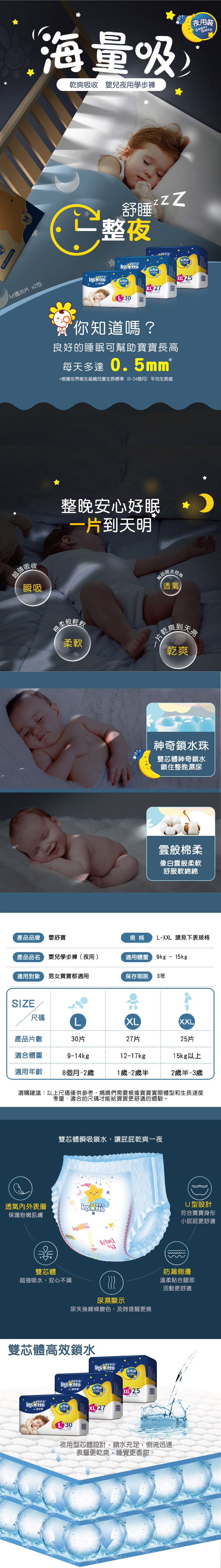 雙芯體瞬吸鎖水屁屁好乾爽,如棉般輕軟柔膚透氣乾爽,尿布疹OUT,乾爽一夜好棉到天亮,防漏隔邊貼合腿為更防漏