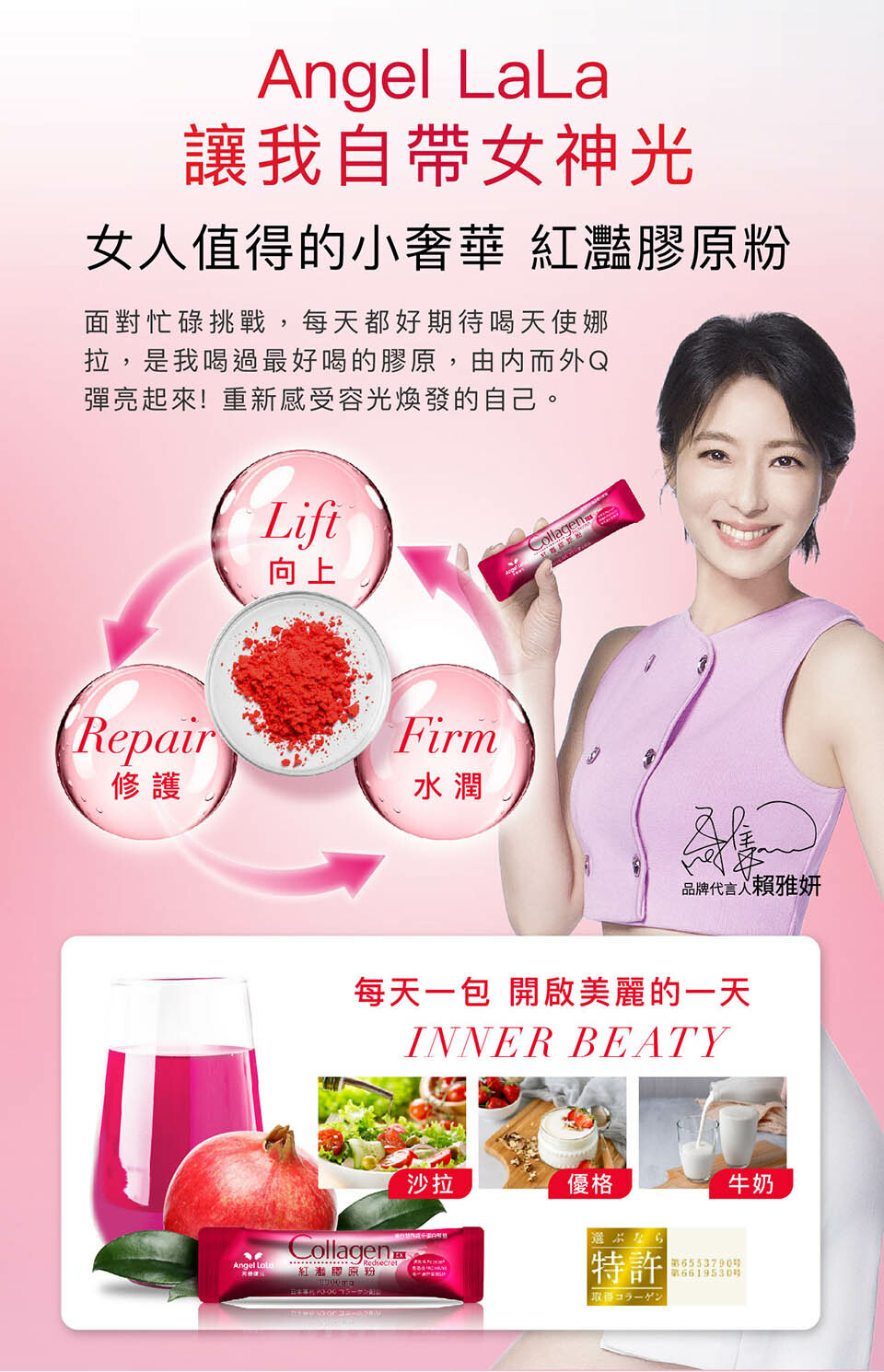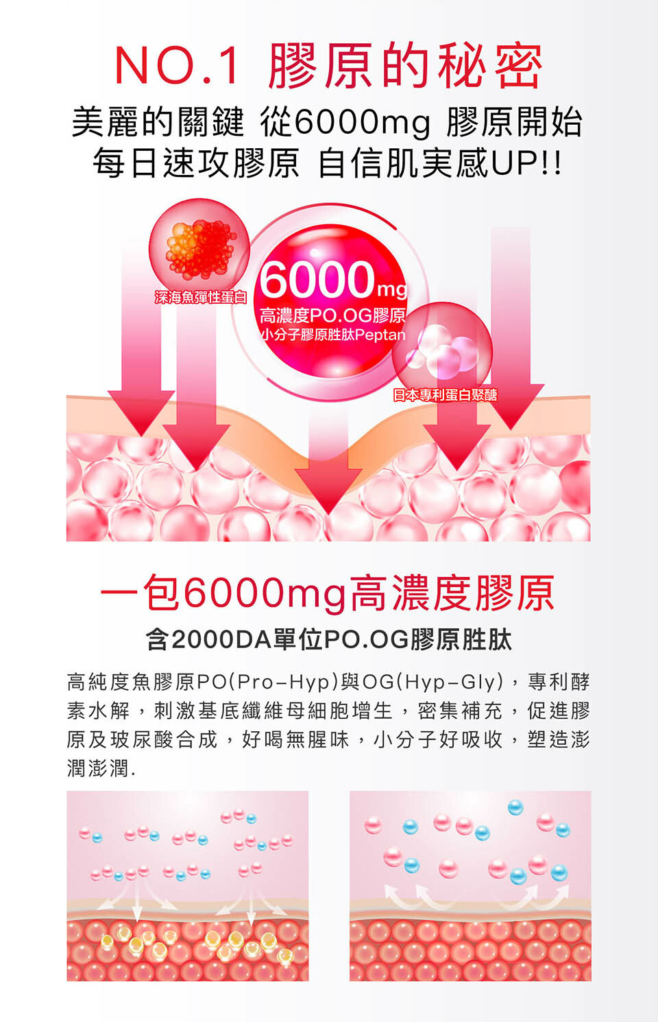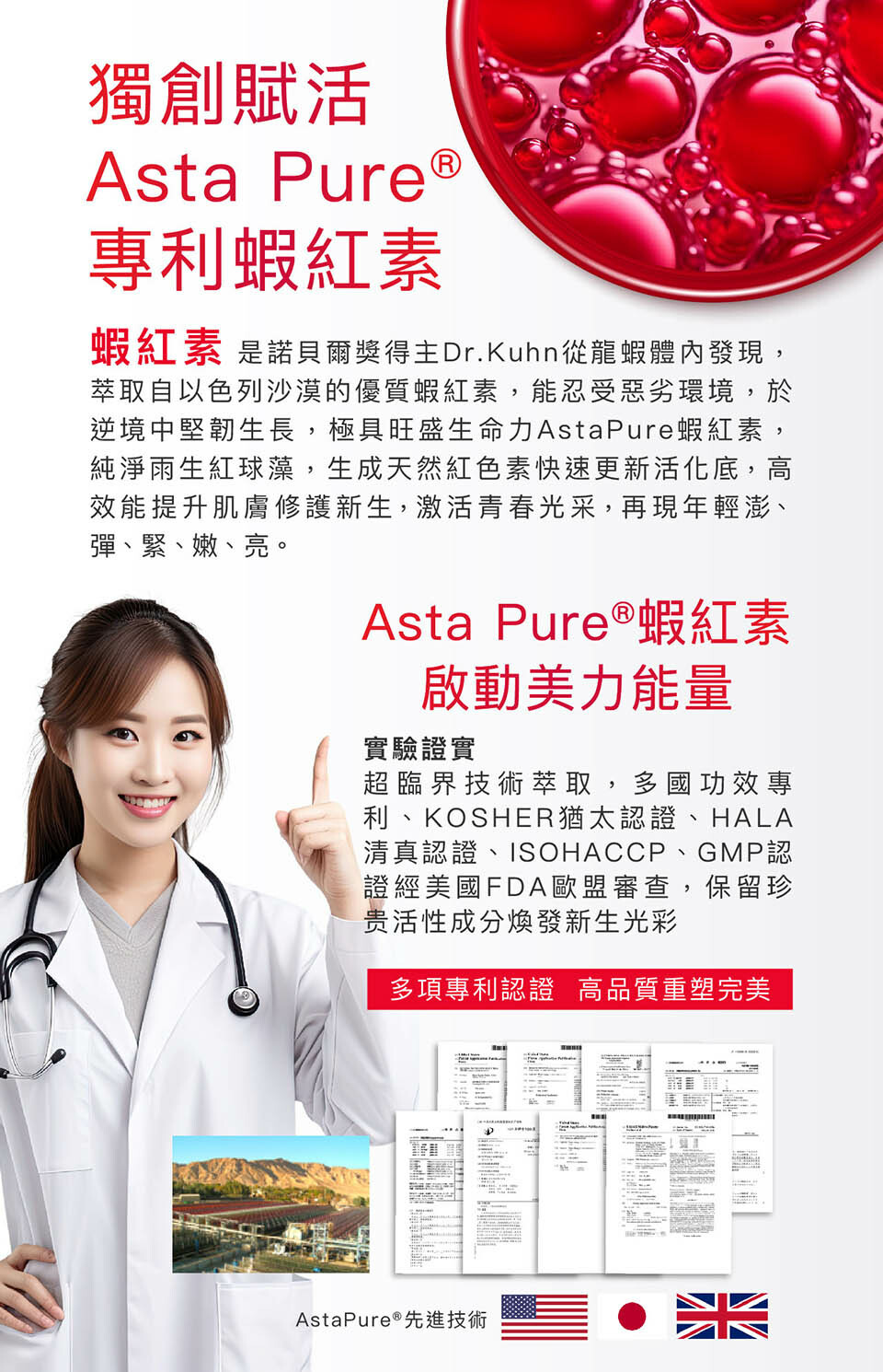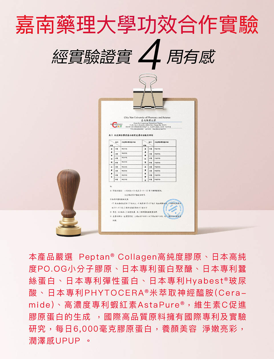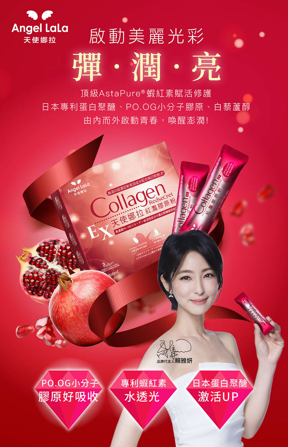 主成分 膠原蛋白, 蝦紅素, 白藜蘆醇, 人蔘