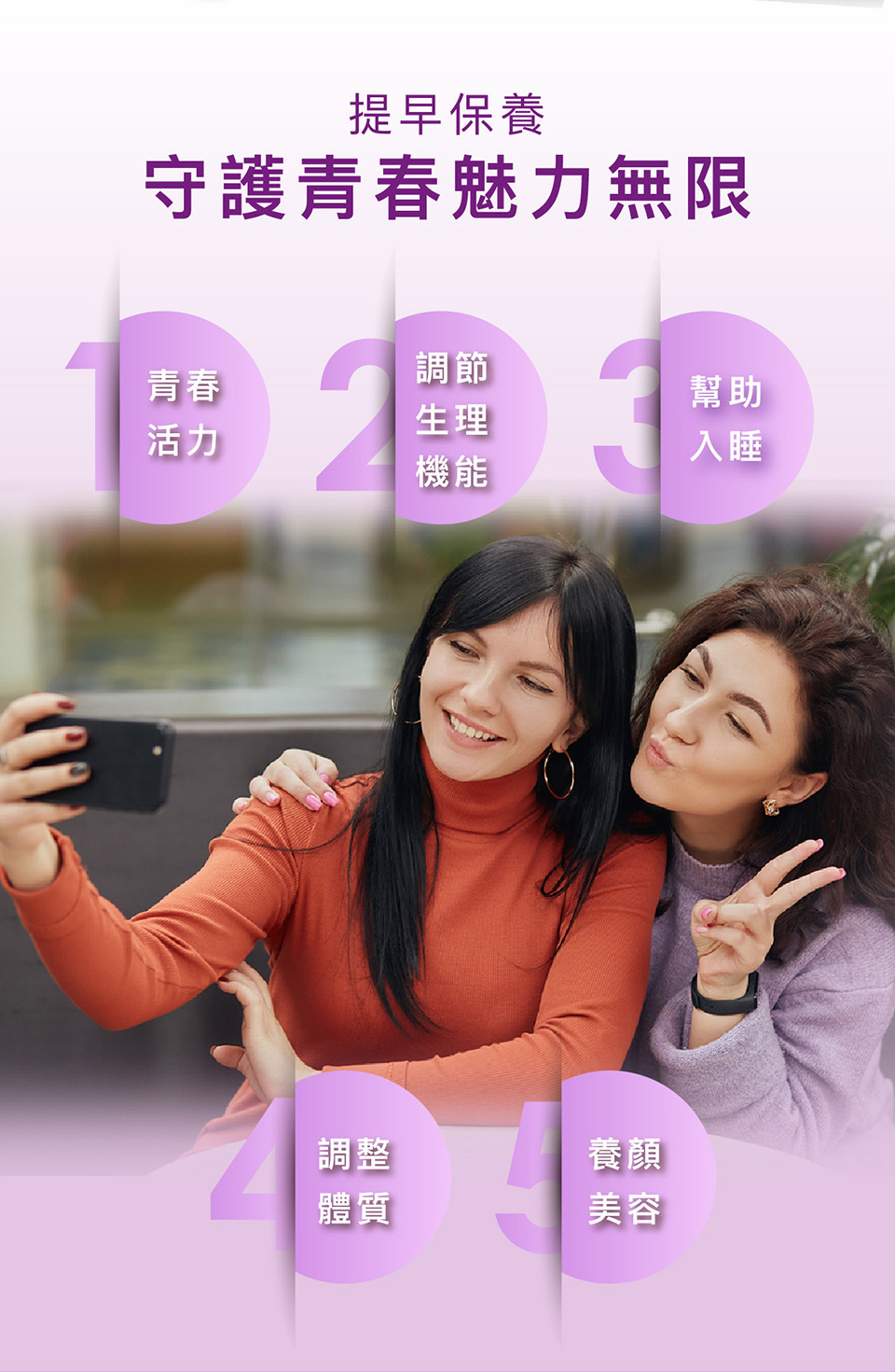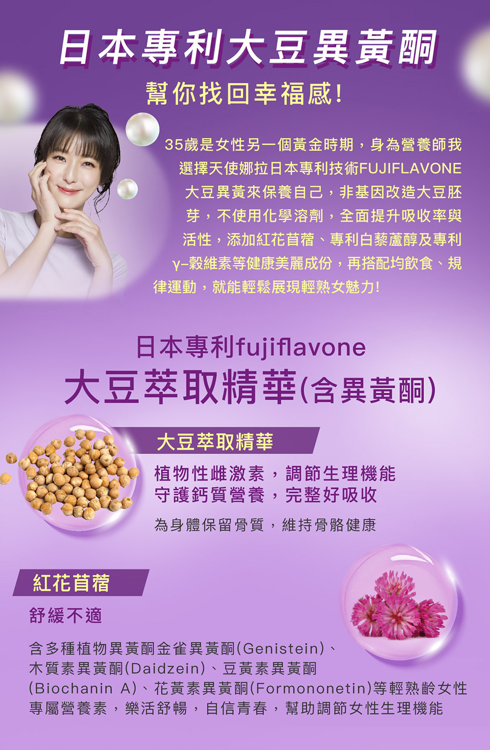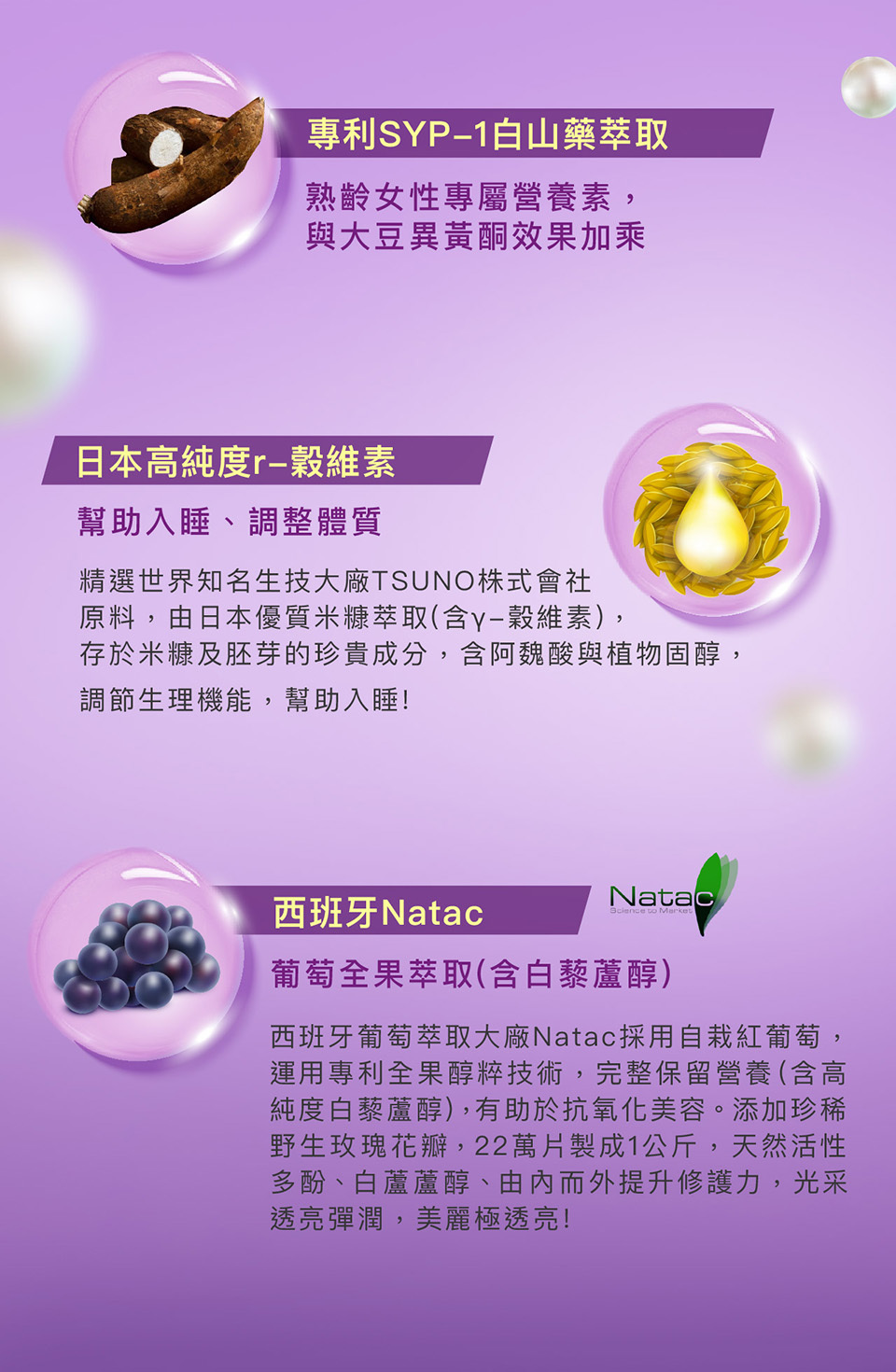 | 主成分 | 大豆異黃酮, 白藜蘆醇, 紅花苜蓿, 葡萄籽, 維他命B |