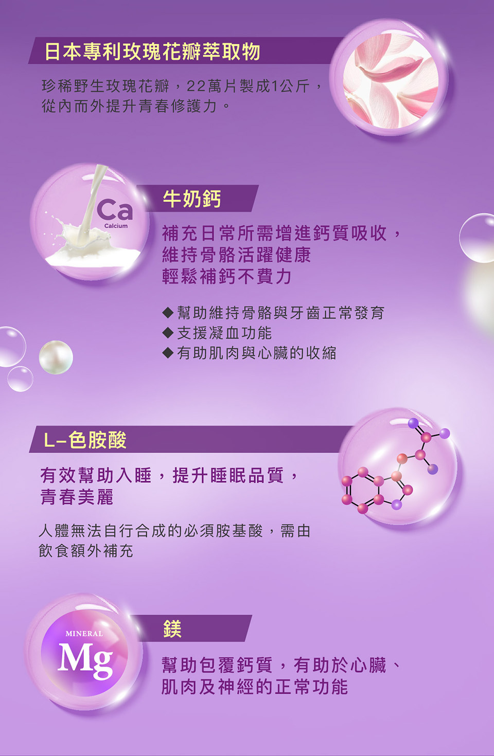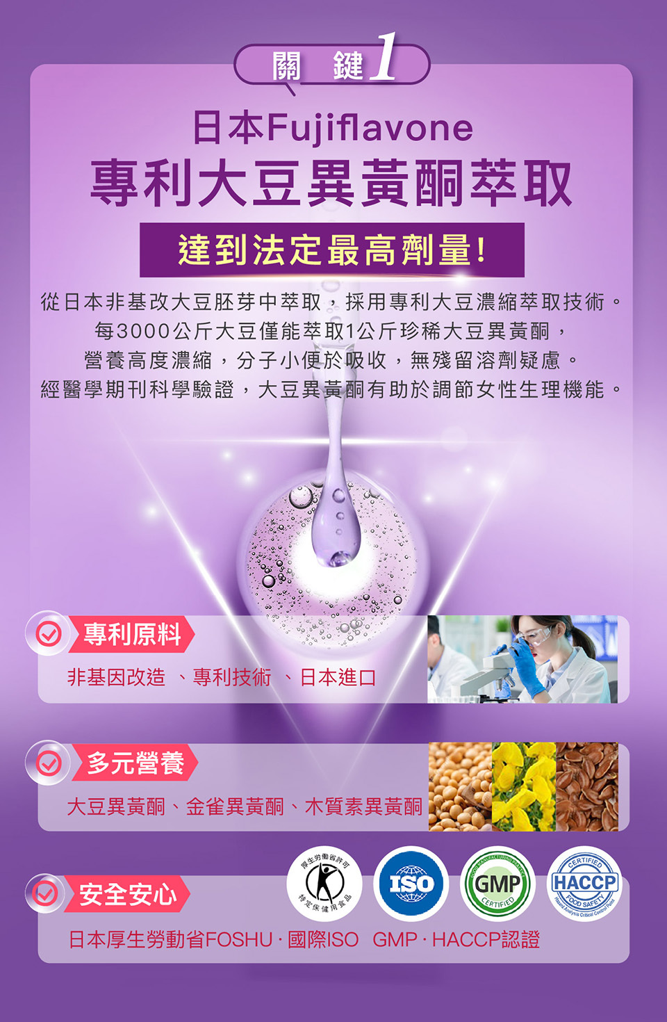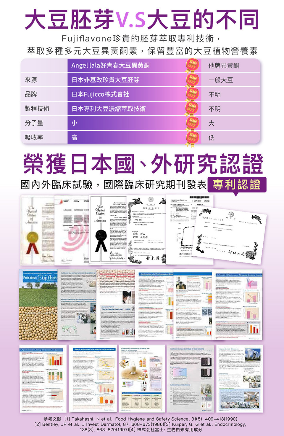 | 主成分 | 大豆異黃酮, 白藜蘆醇, 紅花苜蓿, 葡萄籽, 維他命B |