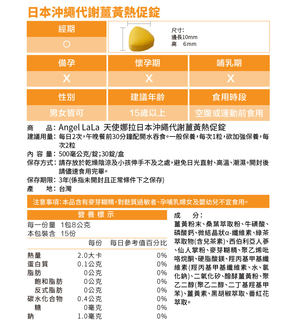 • 1.商品組合/規格:Angel Lala天使娜拉 薑黃熱促錠