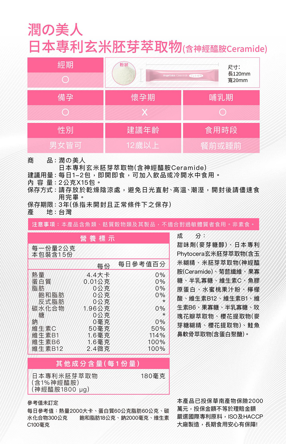 | 商品名稱 | 潤の美人 日本專利米胚芽萃取物(含神經醯胺Ceramide) |