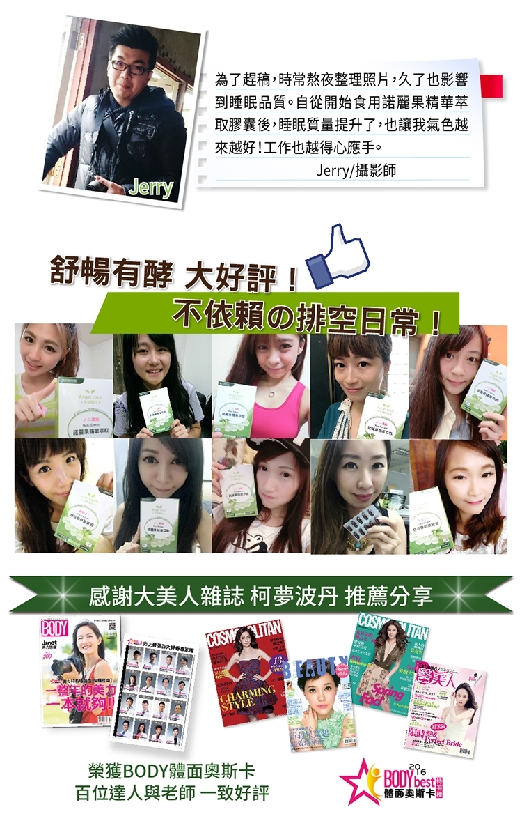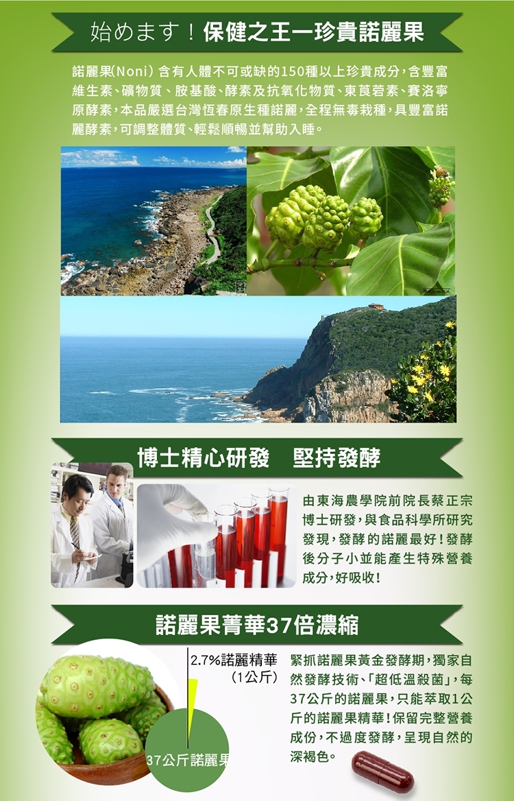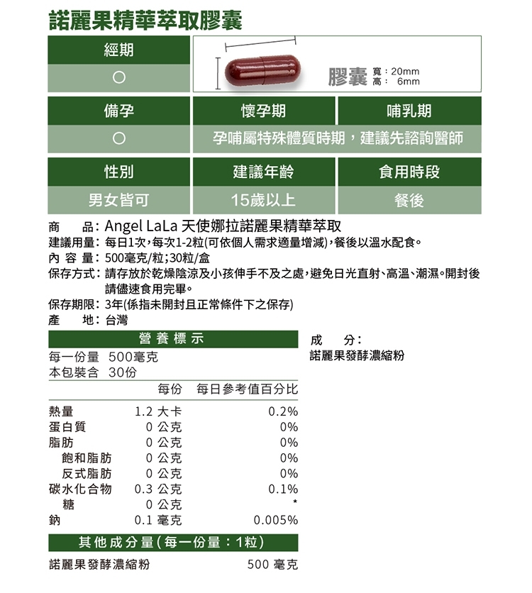 | 商品成分 | 諾麗果發酵濃縮粉 膠囊成份:明膠、純水、甘油、硫酸月桂脂鈉、食用紅色六號、食用黃色四號、食用藍色一號、二氧化鈦 |