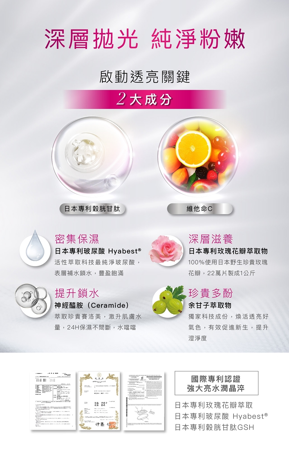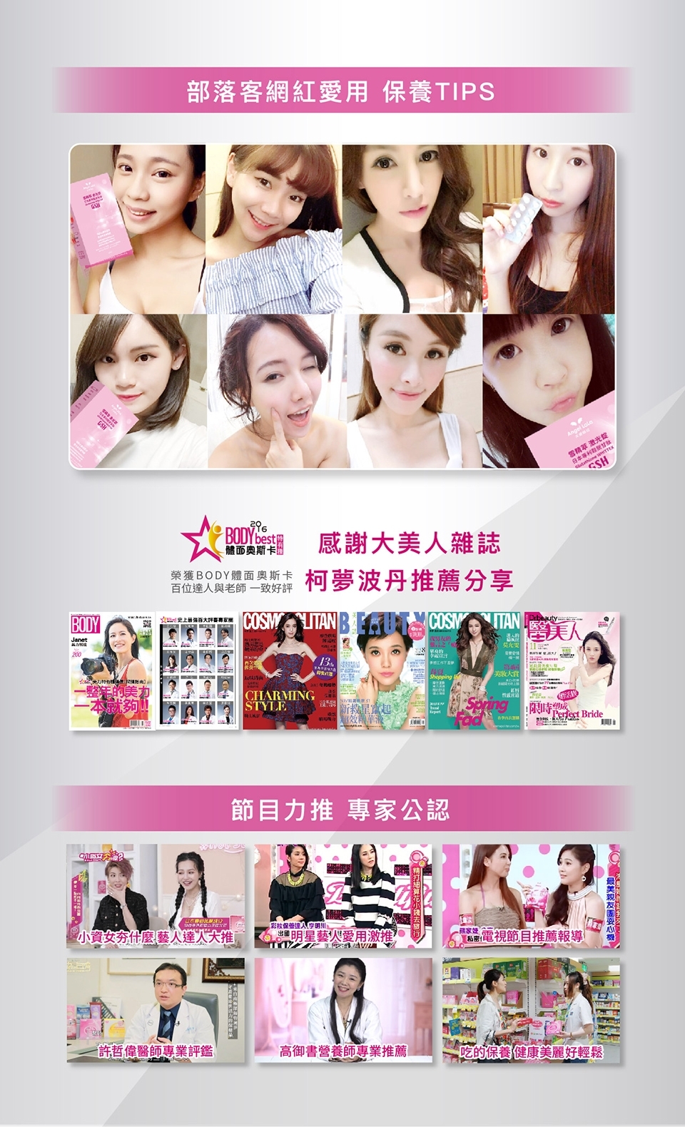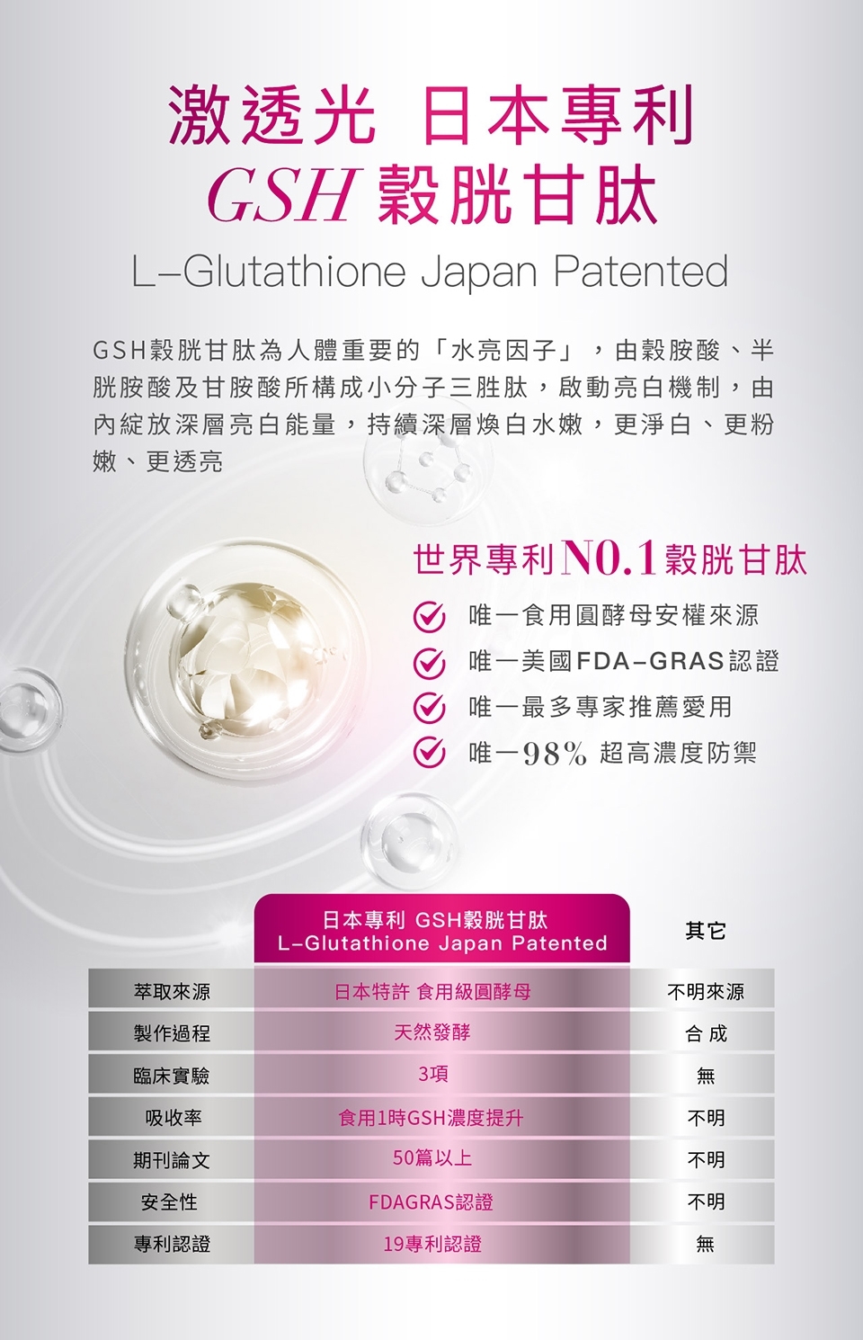 成  分:專利穀胱甘肽(日本還原型L-Glutathione)、維生素C、余甘子萃取物(印度醋栗萃取物)、乳醣、二氧化鈦、聚乙二醇、流行鏈球菌發酵物玻尿酸(含透明質酸鈉)、西印度櫻桃(含維生素C)、牛奶萃取物(含賽洛美)、日本專利玫瑰花瓣萃取物、啤酒酵母粉(含維生素B群)、硬脂酸鎂、羥丙基甲基纖維素。