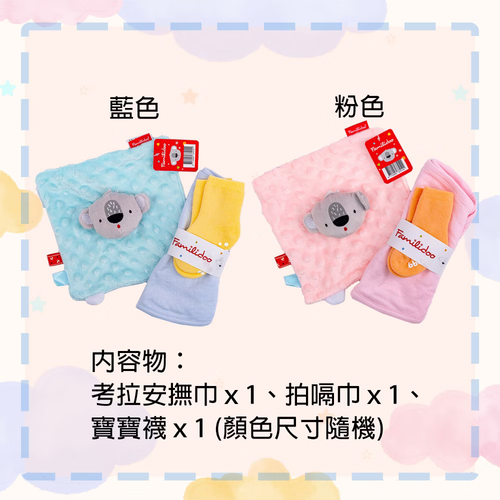 內容物:考拉安撫巾x1、拍嗝巾x1、寶寶襪x1 (顏色尺寸隨機)