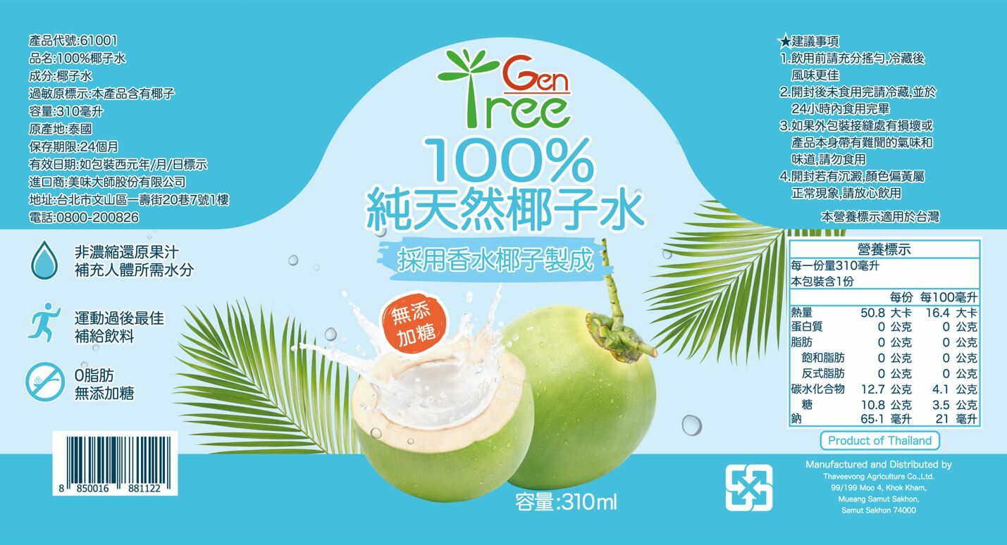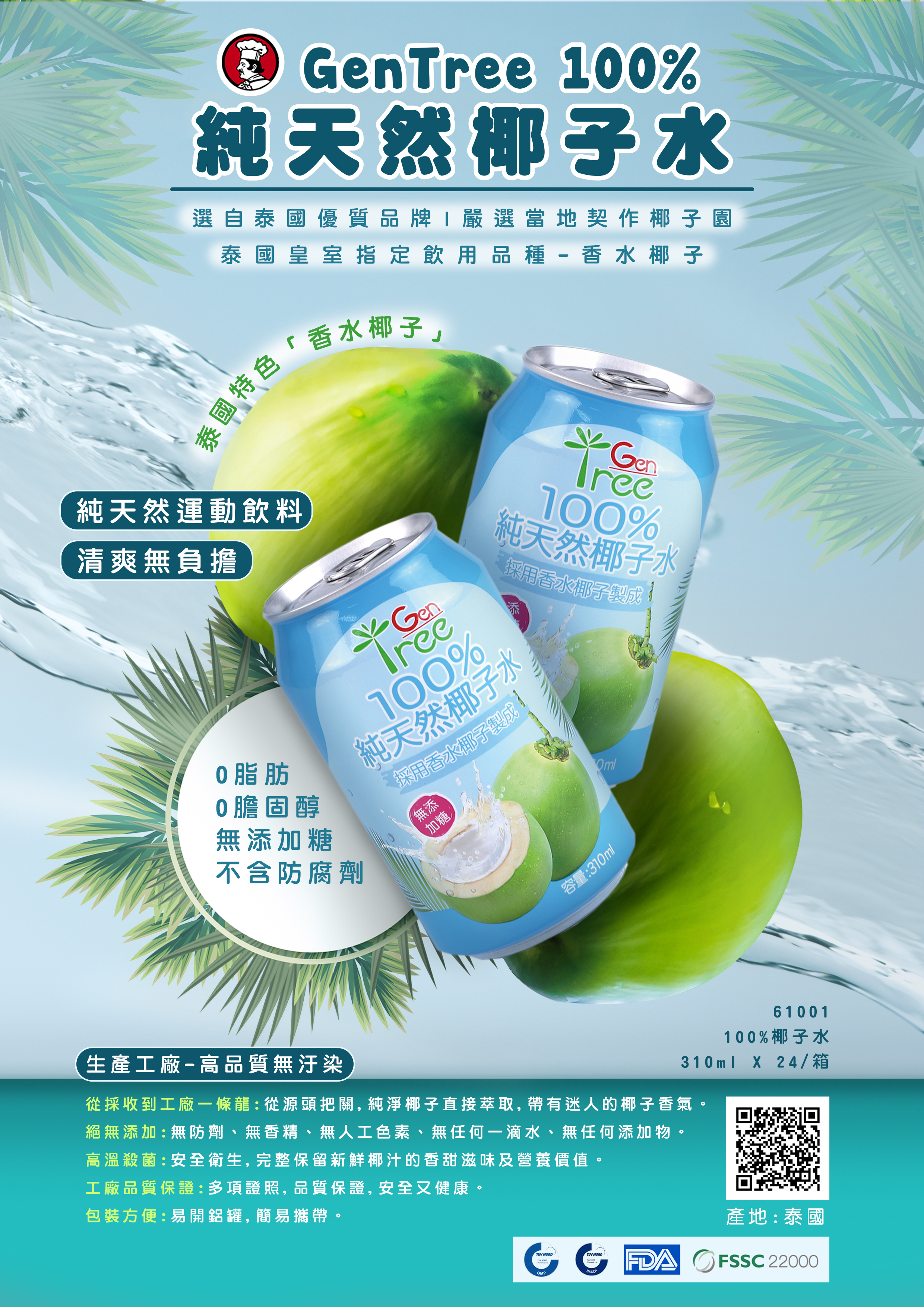 100%純天然椰子水無添加糖、0脂肪、0膽固醇純天然運動飲料、清爽無負擔泰國皇室指定飲用品種-香水椰子選用6個月內年輕椰子!天然芋香,順口又解渴