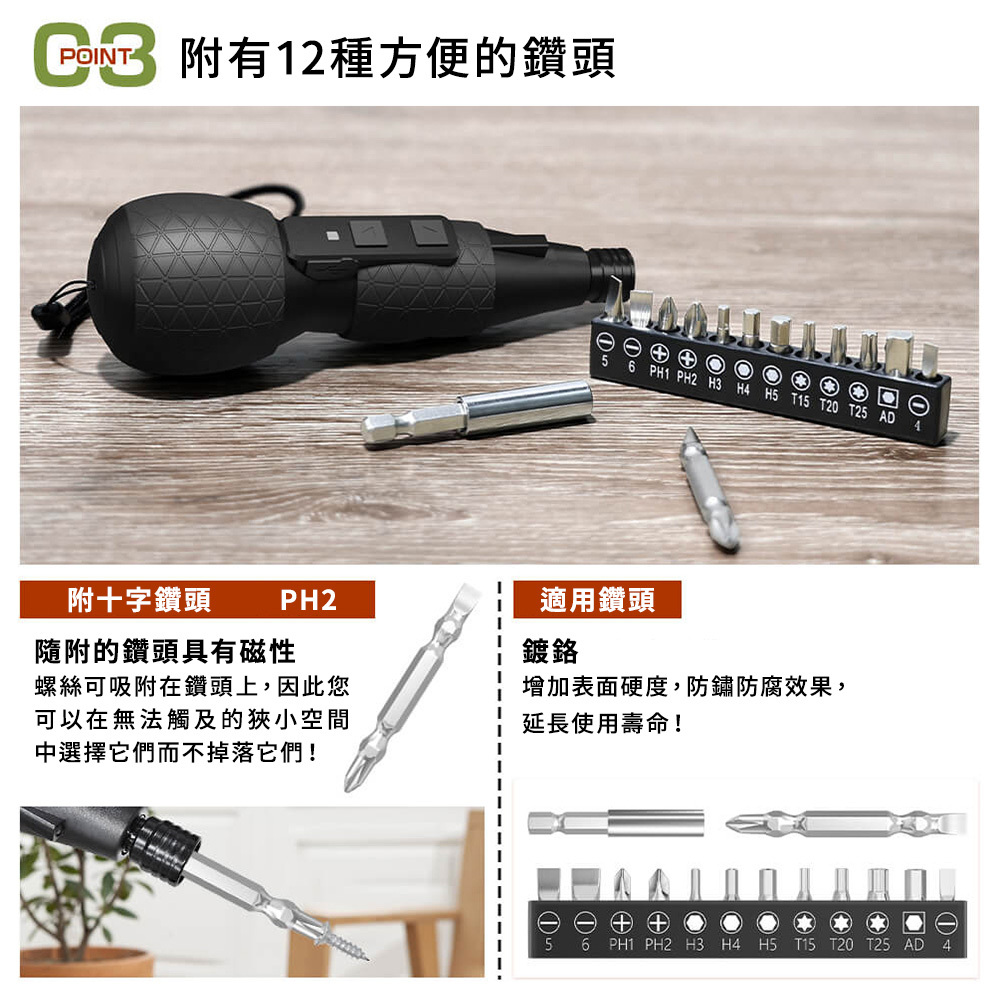 ● 12 種磁吸螺絲頭,不怕螺絲掉落。