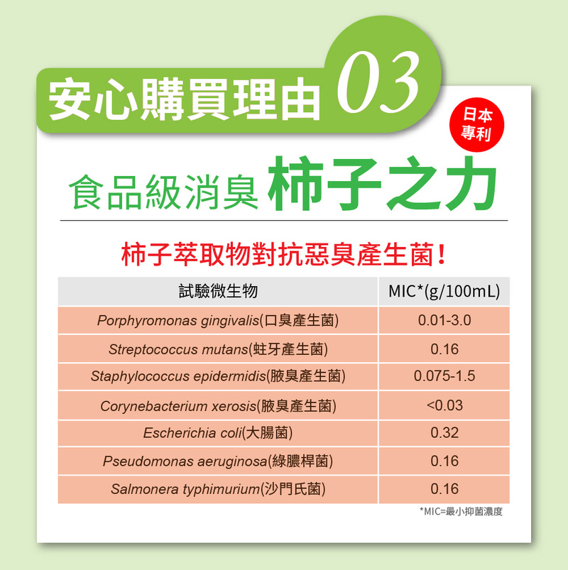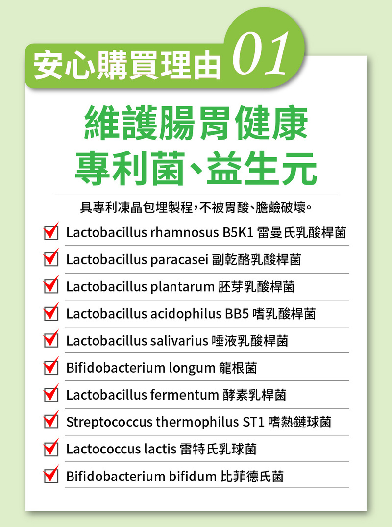 【原料成分】專利玉米來源可溶性纖維、菊糖、柴魚粉、專利十益菌(乳糖、麥芽糊精、乳酸菌粉(Lactobacillus rhamnosus B5K1、Lactobacillus paracasei、Lactobacillus plantarum、Lactobacillus acidophilus BB5、Lactobacillus salivarius、Bifidobacterium longum、Lactobacillus fermentum、Streptococcus thermophilus ST1、Lactococcus lactis、Bifidobacterium bifidum)、脫脂牛奶))、果寡糖、麥芽糊精、綜合維生素礦物質(磷酸鈣、氧化鎂、麥芽糊精、抗壞血酸(維生素C)、焦磷酸鐵、乙酸dl-a-生育醇酯(維生素E)(乙酸dl-α-生育醇酯、辛烯基丁二酸鈉澱粉、水、二氧化矽)、碳酸鈣、菸鹼醯胺、氧化鋅、三氯化鉻(麥芽糊精、三氯化鉻)、硫酸錳、碘化鉀(麥芽糊精、碘化鉀)、硫酸銅、維生素A粉末(蔗糖、玉米澱粉、阿拉伯膠、維生素A醋酸鹽、水、生育醇(抗氧化劑)、磷酸鈣)、本多酸鈣、葉酸(葡萄糖、葉酸)、生物素(葡萄糖、生物素)、氰鈷胺明(維生素B12)(麥芽糊精、檸檬酸鈉、檸檬酸、氰鈷胺明)、鹽酸吡哆辛(維生素B6)、膽鈣化醇(維生素D3)(蔗糖、阿拉伯膠、玉米澱粉、中鏈三酸甘油酯、水、磷酸鈣、膽鈣化醇、生育醇(抗氧化劑))、硝酸硫胺明(維生素B1,硝酸噻胺)、核黃素(維生素B2))、日本專利柿子萃取(海藻糖、柿子萃取物、碳酸鈉)