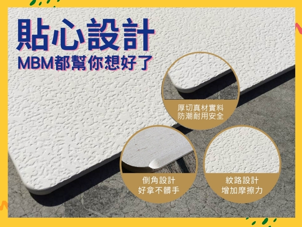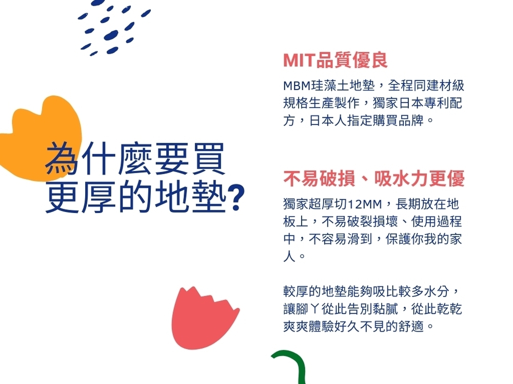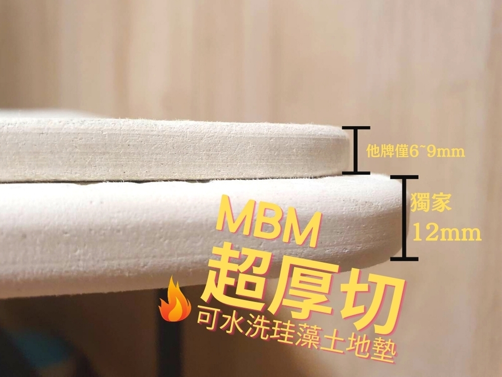 MBM珪藻土地墊,全程同建材規格生產製作,獨家日本專利配方,不但吸水力強,還兼具除濕、除臭的優點,地墊髒了可直接水洗清潔,放置陰涼處陰乾,可重複使用不易脆裂。高壓氧生的建材級規格生產線遵循MBM建材級製程製作珪藻土/硅藻土 日本專利配方,吸水除濕、調濕效果好, 其中鈣離子成分使得地墊不長菌, 高壓製程,使地墊使用時間延長, 直接刷洗不脆裂,負重可達至少125公斤 超細心圓角設計,提升居住品質.
