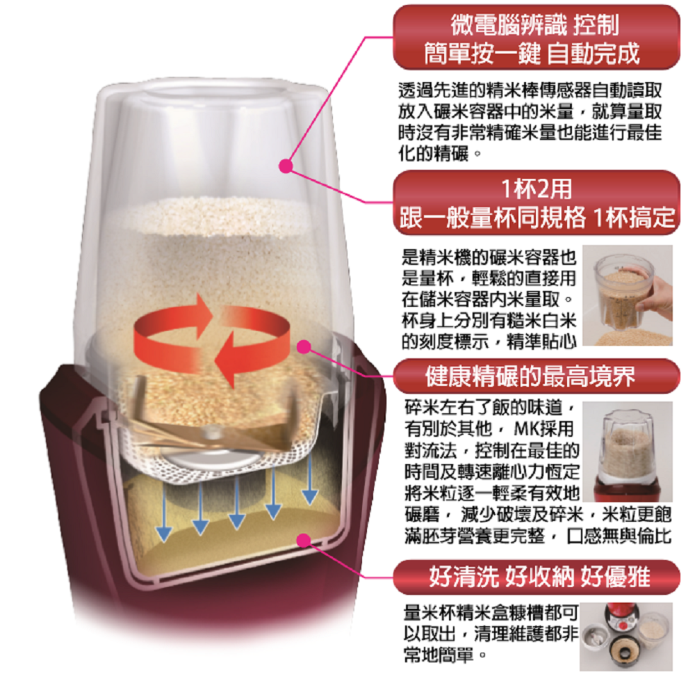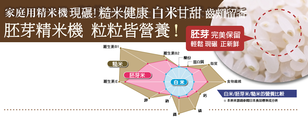 ● 用健康胚芽精米機精的米,不會像市售商品那樣白. 主要是因為自己 DIY 精米,可以減少磨損米的鮮味及營養,保有更多富含維生素 B1 及 E 的營養胚芽和膳食纖維,讓白飯吃得更美味,更健康!