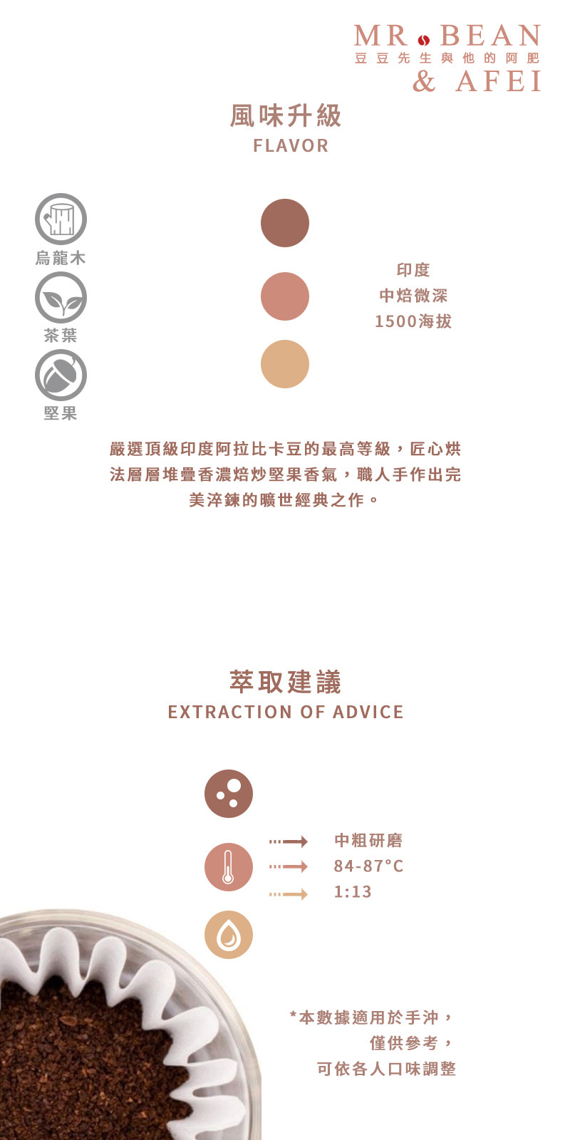 - 嚴選頂級印度阿拉比卡豆的最高等級,匠心烘法層層堆疊香濃焙炒堅果香氣,職人手作出完美淬鍊的曠世經典之作。