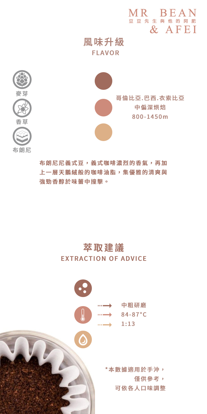 - 義式咖啡濃烈的香氣,再加上一層天鵝絨般的咖啡油脂,豐富的烘烤及穀物香調,口感綿密絲滑,令人留戀不已,集優雅的清爽與強勁香醇於味蕾中撞擊。