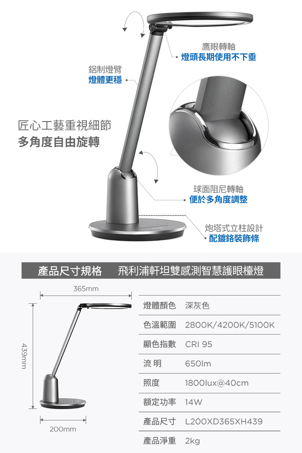 品牌名稱:Philips 飛利浦類型:LED燈泡座式一般插頭式其他顏色:灰色功能:其他保固期:1年保固期※如有錯誤,以原廠公告為主材質:鋁合金使用壽命達:15,000 h燈具總流明輸出:650 lm照度:1800Lux@40cm色溫範圍:2800K、4200K、5100K顯色指數:CRI 95主電源範圍:100 V - 240 V、50-60 HzLED:是內建 LED:是隨附光源能源等級:內建 LED燈泡數量:1替換燈泡最高瓦數:9.6 W額定功率:14WIP 防護等級:IP20 不防水防護等級:II - 雙層絕緣BSMI:免驗函(R3A588)※商品規格及保固說明若有錯誤,以原廠公告為主商檢字號:R3A588
