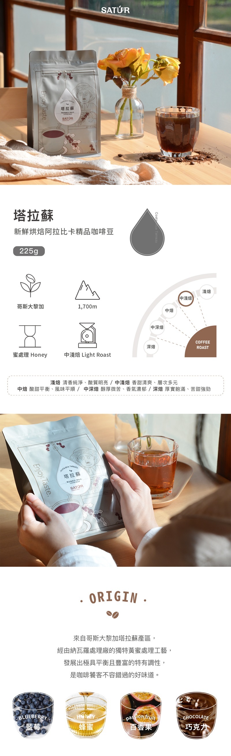 來自哥斯大黎加塔拉蘇產區,採用保留部分果肉的蜜處理發酵方式,相較於傳統的發酵法更需專注細緻。