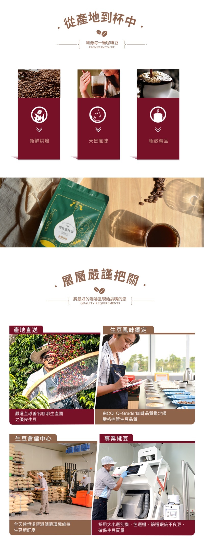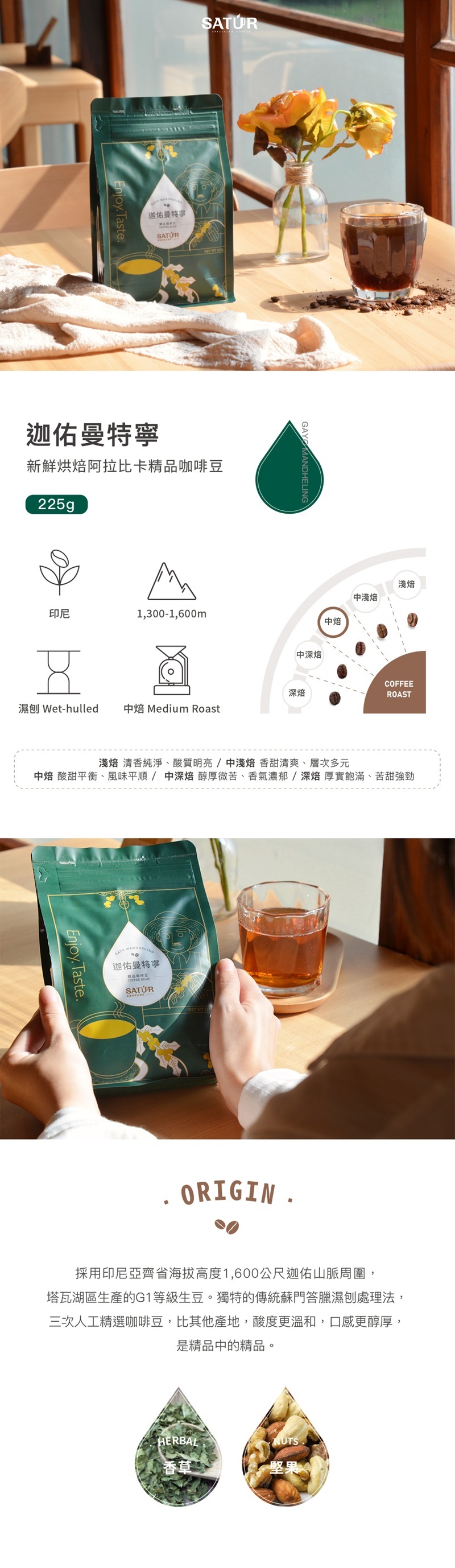採用印尼亞齊省海拔高度1,600公尺迦佑山脈周圍,塔瓦湖區生產的G1等級生豆。獨特的傳統蘇門答臘半水洗方式生豆處理,三次人工精選咖啡豆,比其他產地,酸度更溫和,口感更醇厚,是精品中的精品。