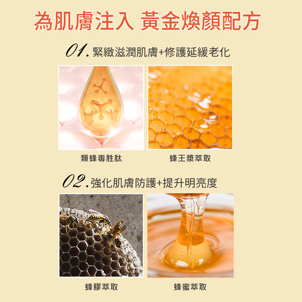 成分:類蜂毒胜肽.蜂蜜萃取、蜂膠萃取、蜂王漿萃取、花粉萃取、麝香玫瑰籽精油