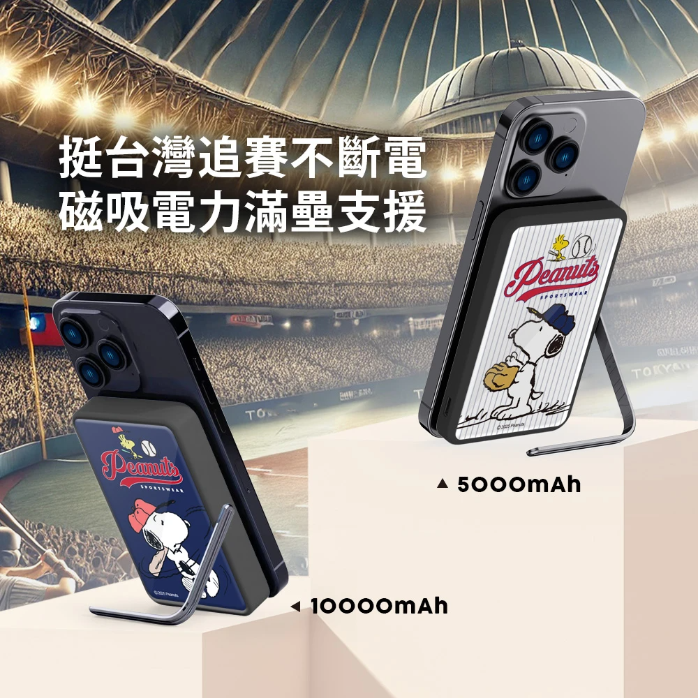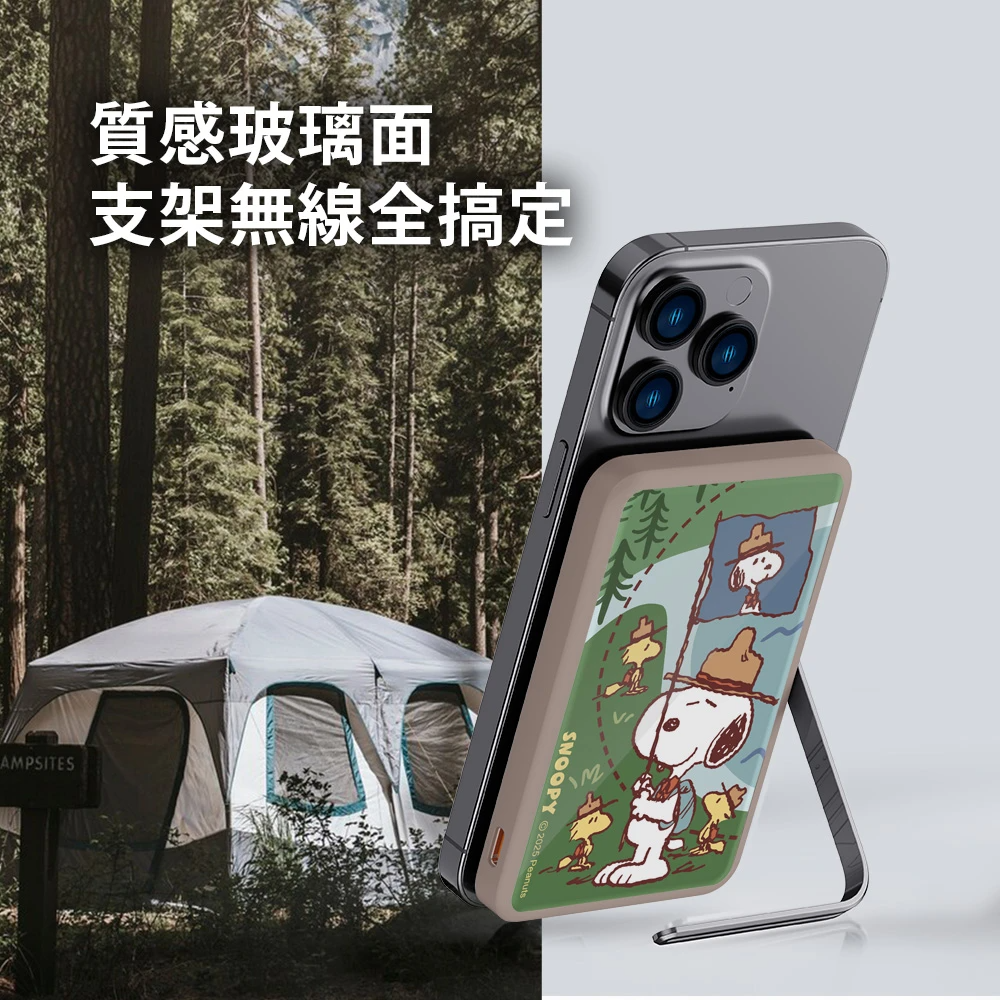 【SNOOPY史努比】20W PD快充 質感玻璃面 磁吸無線充側支架行動電源5000mAh 英雄白