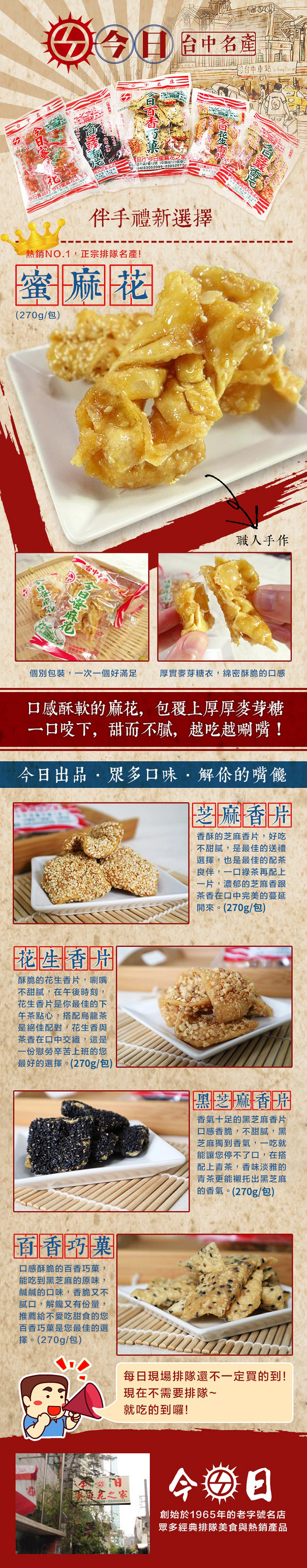●台中名產今日蜜麻花系列,純手工製作,用料實在、口感獨特!