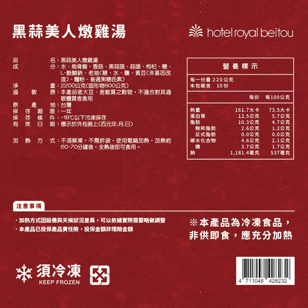 ※ 黑蒜美人燉雞湯-本產品含大豆、含麩質之穀物,不適合對其過敏體質者食用。