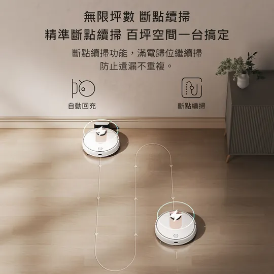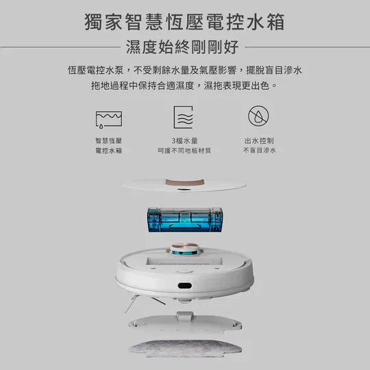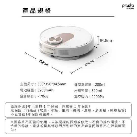 內容物: 主機*1、充電座(含充電插頭)*1、說明書*1、拖布板*1、水洗式拖布*2、邊刷*2