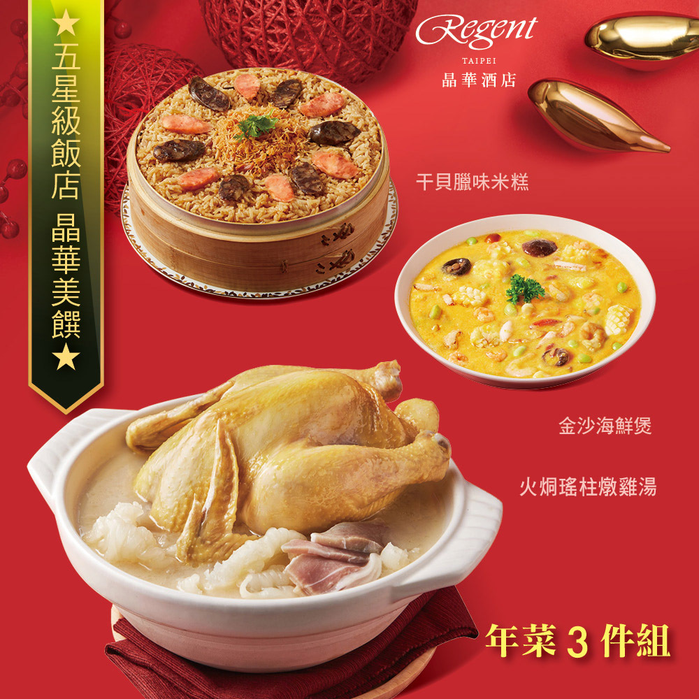 商品組合/規格:【台北晶華酒店】年菜3件組(火烔瑤柱燉雞湯+干貝臘味米糕+金沙海鮮煲)