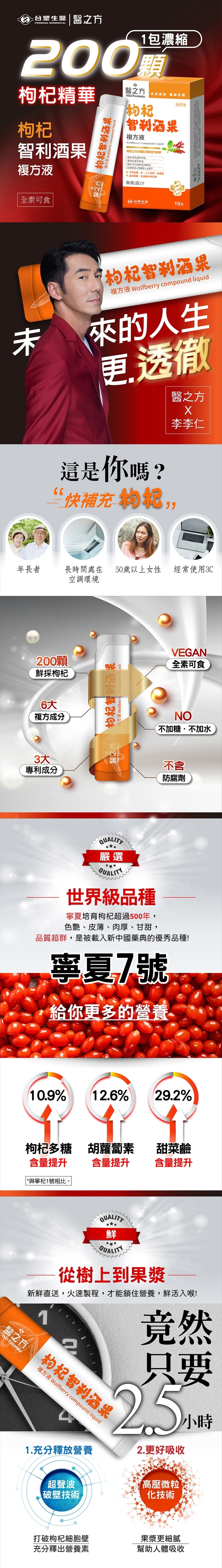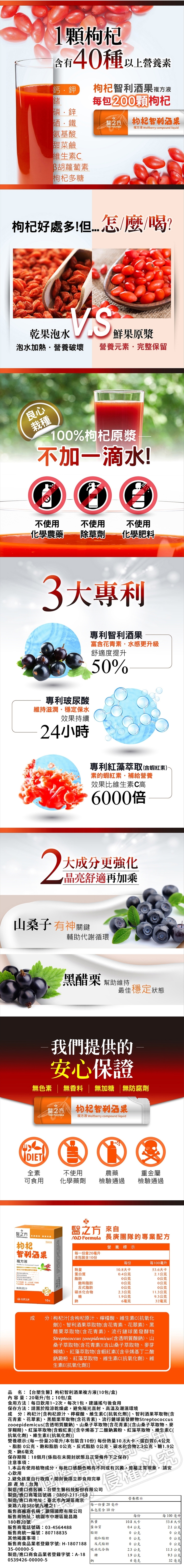 | 成分說明 | 枸杞汁[含枸杞原汁、檸檬酸、維生素C(抗氧化劑)]、智利酒果萃取物(含花青素、花翠素)、黑醋栗萃取物(含花青素)、流行鏈球菌發酵物Streptococcus zooepidemicus(含透明質酸鈉)、山桑子萃取物(含花青素)(含山桑子萃取物、麥芽糊精)、紅藻萃取物(含蝦紅素)[含辛烯基丁二酸鈉澱粉、紅藻萃取物、維生素C(抗氧化劑)、維生素E(抗氧化劑)] |