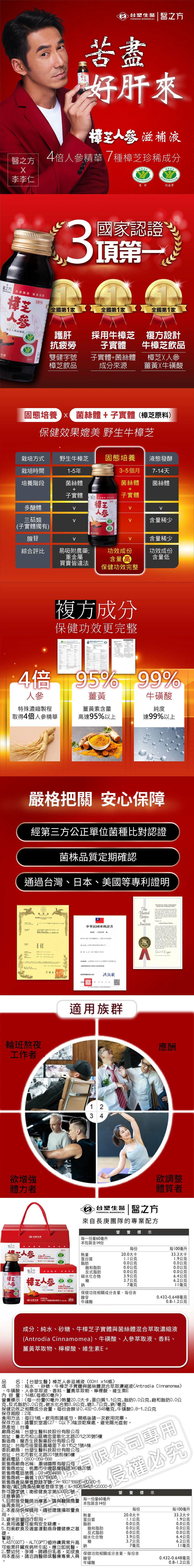 成    分:純水 、砂糖、牛樟芝子實體與菌絲體混合萃取濃縮液 (Antrodia Cinnamomea)、牛磺酸、人參萃取液、香料、薑黃萃取物、檸檬酸、維生素 E。