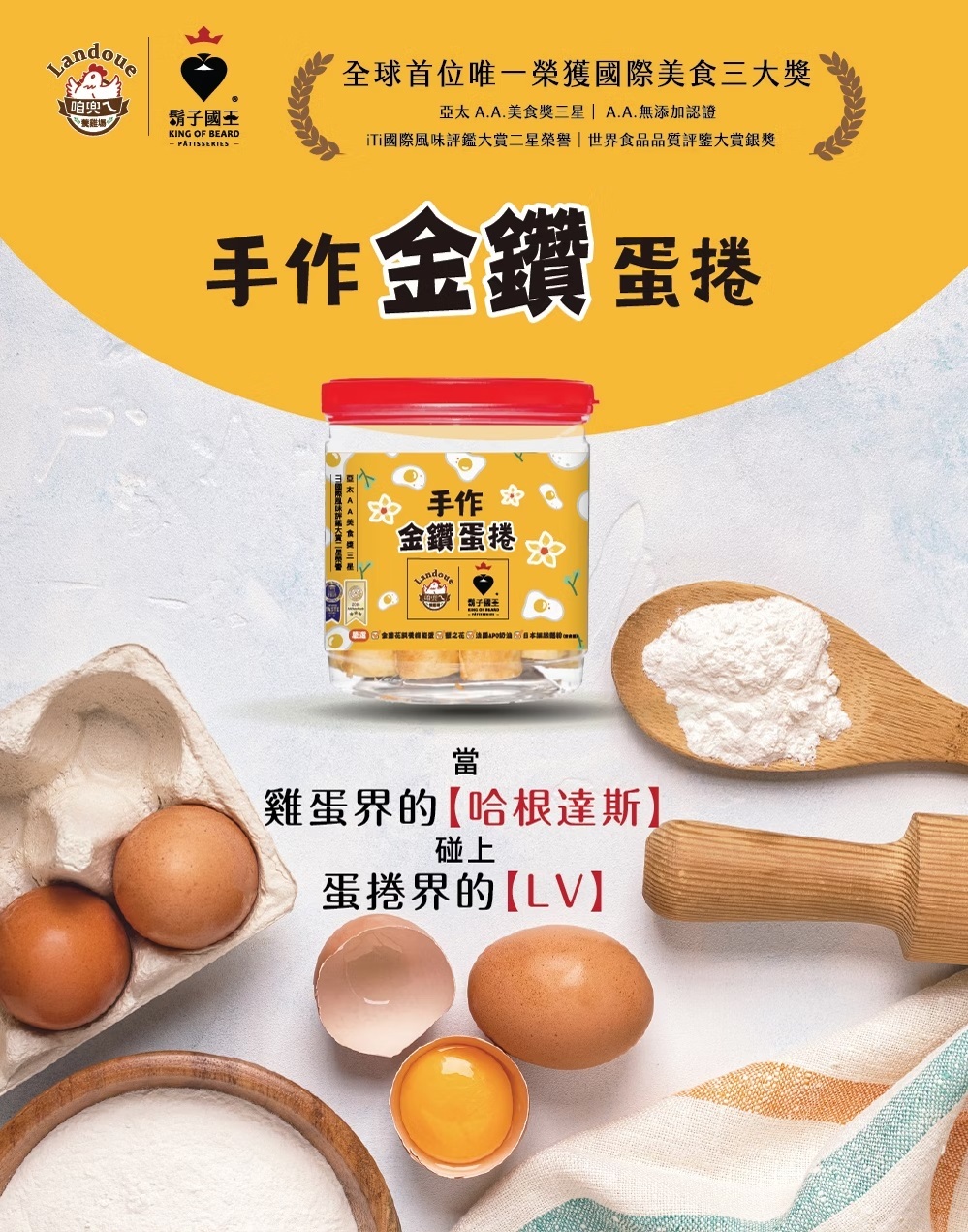 ● 與蛋捲界的 LV【鬍子國王】強力聯名,全球首位唯一榮獲國際美食三大獎(亞太 A.A. 美食獎三星、世界食品品質評鑑大賞銀獎、iTi 國際風味評鑑大賞二星榮譽)。