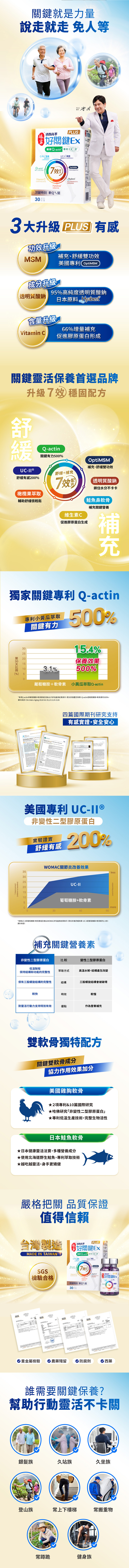 原料成分:微結晶狀 α-纖維素、OptiMSM® 甲基硫醯基甲烷(甲基硫醯基甲烷、二氧化矽)、複方碳酸鈣 (碳酸鈣、糊精、阿拉伯膠)、Hytolive® 橄欖抽出物 (麥芽糊精、橄欖抽出物、二氧化矽)、維生素 C、UC-II® 膠原蛋白複合物【雞胸軟骨(含二型膠原蛋白)、氯化鉀】、Q-actin® 小黃瓜萃取物、硬脂酸鎂、二氧化矽、鮭魚鼻軟骨萃取物 (含蛋白聚醣)、Hyabest® 流行鏈球菌發酵物(含透明質酸鈉)。
