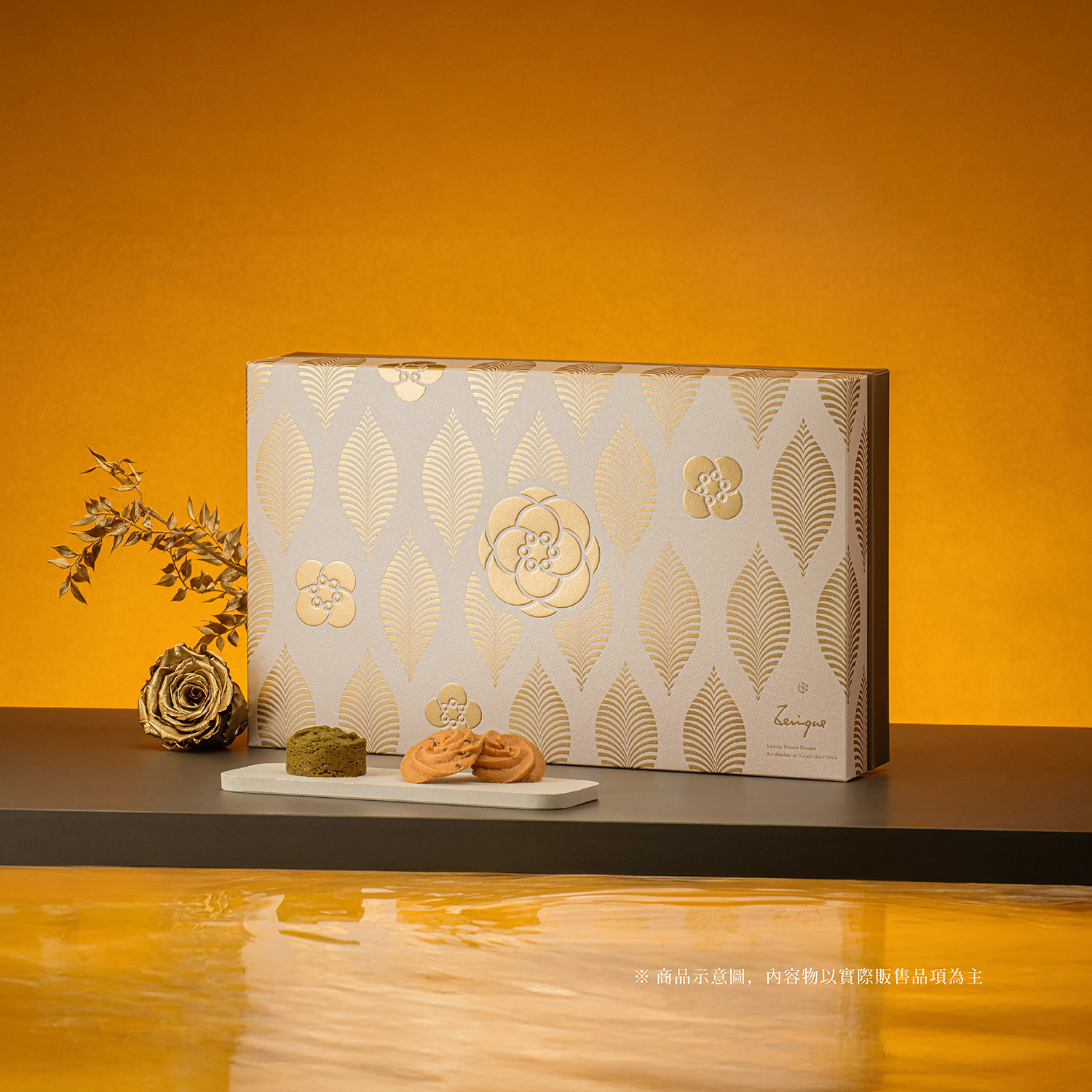 ● 「金采禮盒」杏金色織紋美術紙呈現典雅氣質,打凸的幾何圖型象徵茶花在茶園盛開,燙霧金效果在不同角度下呈現獨特光澤。