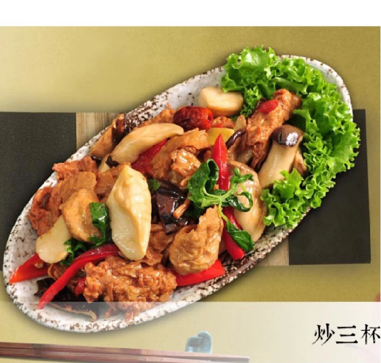 ●顛覆台灣傳統三杯烹調風格,以獨特的葯膳風味,珍選台灣在地食材香菇、杏鮑菇、大豆蛋白、葯膳G塊、紅棗、再以九層塔麻油醬燒入味,當您享用此道菜餚時,多層次香醇口感令人讚嘆。