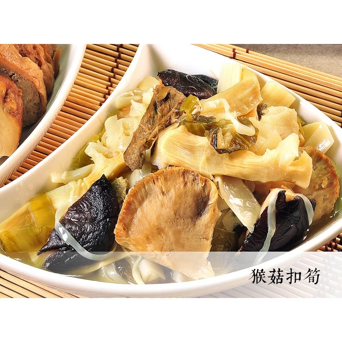 ●用心揀選出超細嫩富脆感的筍干,經師傅巧妙將扣菜結合了猴頭菇及素羊肉上等食材,猴頭菇的香Q口感及素羊肉入筍干風味後,這種特別的古早味,深深的撼動著你我思古情懷。