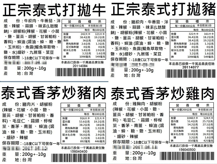 【泰式香茅炒豬肉:200g±10g/包】內容物/成份:豬肉片(台灣)、胡椒粉、毛豆仁、蒜頭、檸檬葉、香茅、南薑、蠔油、細砂、辣椒