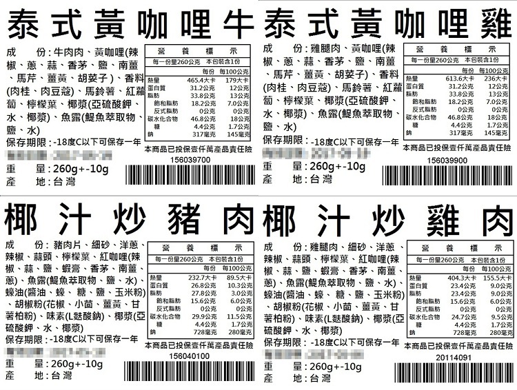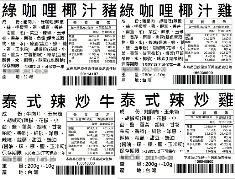 【綠咖哩椰汁豬:260g±10g/包】內容物/成份:豬肉片(台灣)、綠咖哩、菜豆、辣椒、玉米筍、香茅、南薑、魚露、蠔油、胡椒粉、椰漿、味素