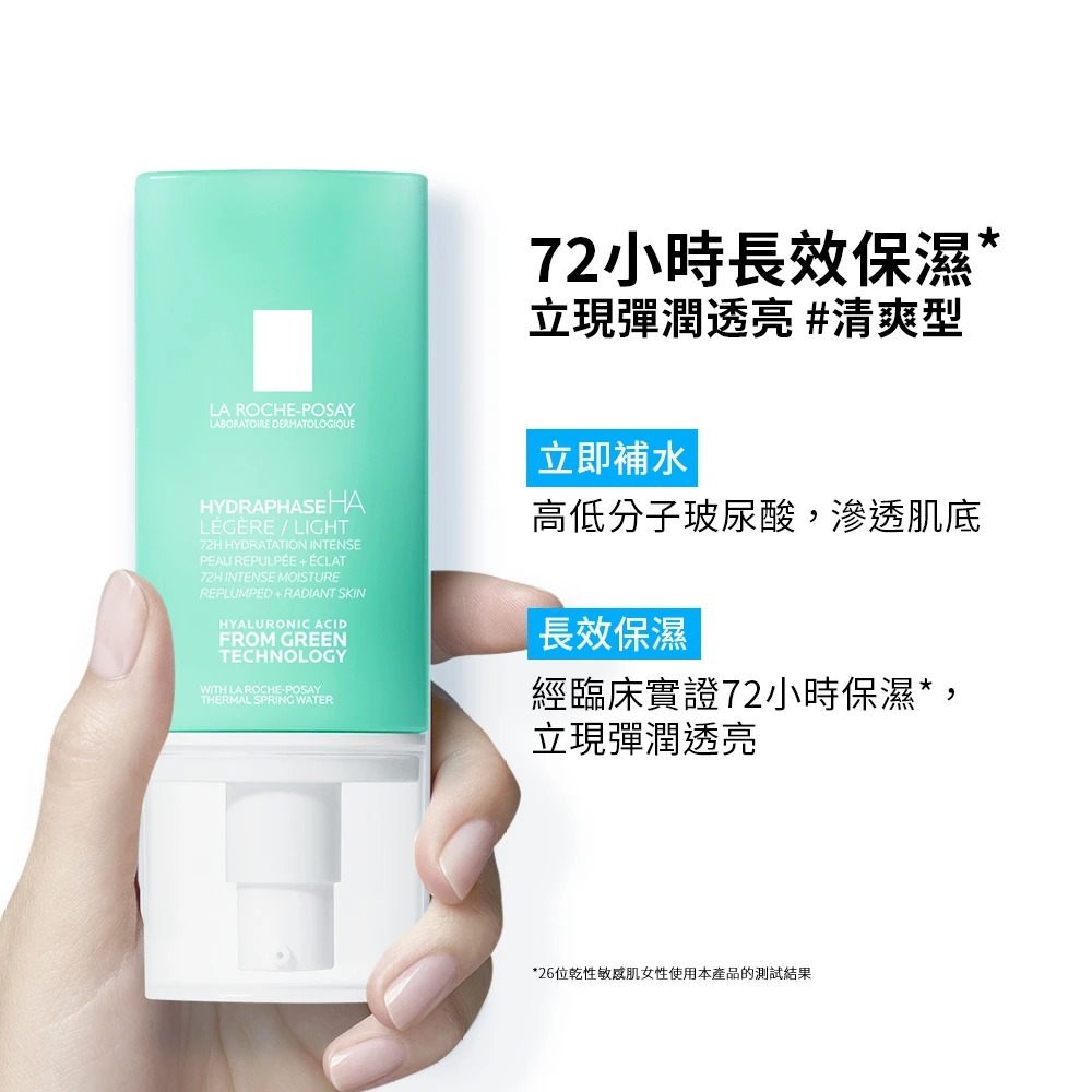 產品說明:100%天然有機玻尿酸萃取科技,升級添加高低分子玻尿酸、理膚寶水溫泉水、甘油、雪亞脂與尿素等保濕成分,立即補水,滲透肌底,經臨床實證72小時長效保濕*,立現彈潤透亮。適合中性與乾性肌膚。敏感肌適用。