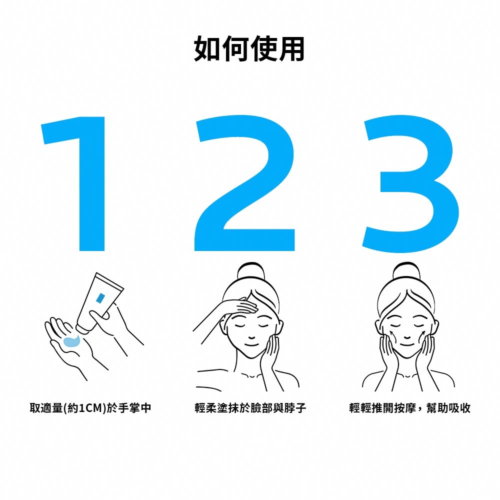 用法:每日早晚臉部清潔與使用化妝水(或精華液)後,取適量均勻塗抹於臉部及頸部。