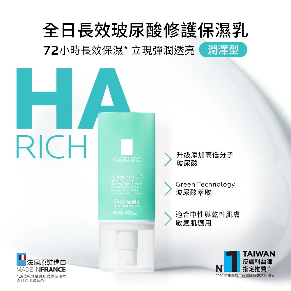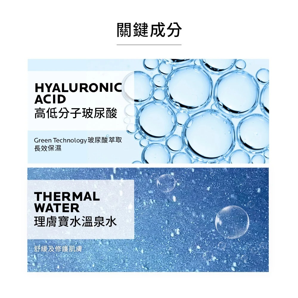 產品說明:100%天然有機玻尿酸萃取科技,升級添加高低分子玻尿酸、理膚寶水溫泉水、甘油、雪亞脂與尿素等保濕成分,立即補水,滲透肌底,經臨床實證72小時長效保濕*,立現彈潤透亮。適合中性與乾性肌膚。敏感肌適用。