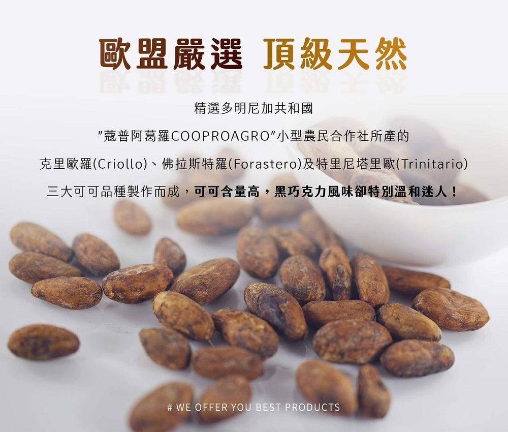 ● 精選多明尼加共和國「蔻普阿葛羅 COOPROAGRO」小型農民合作社所產的克里歐羅 (Criollo)、佛拉斯特羅 (Forastero) 及特里尼塔里歐 (Trinitario) 三大可可品種製作而成,可可含量高,黑巧克力風味卻特別溫和迷人!