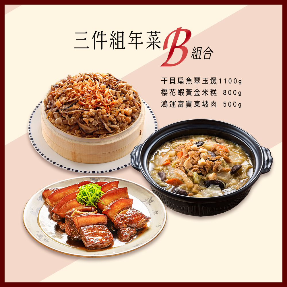 【竹南懷舊】年菜3件組B組(干貝扁魚翠玉煲1100g+櫻花蝦黃金米糕800g+鴻運富貴東坡肉500g)[低溫配送]