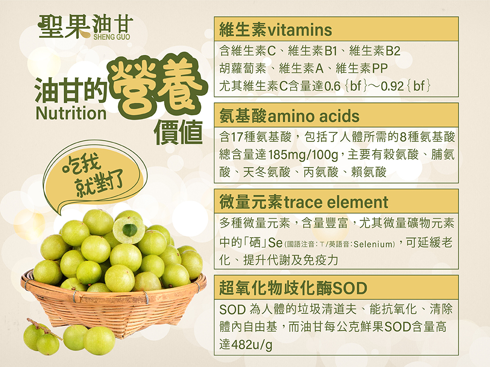 油甘果本身其澀、鹹、苦、甘、甜、高纖,帶動唾液分泌的功能,為兼具食療效用的水果。