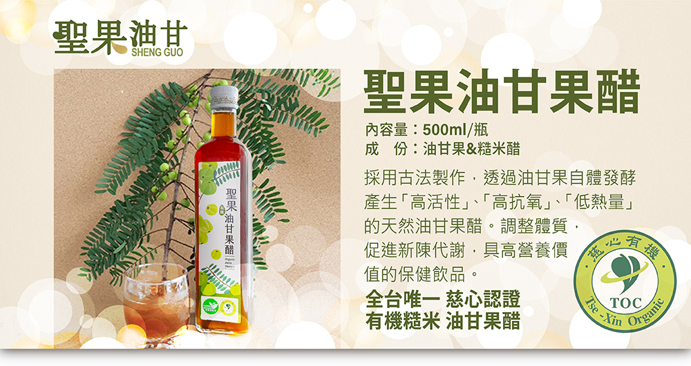 特色:採用古法製作,透過油甘果自體發酵產生「高活性」、「高抗氧」、「低熱量」的天然油甘果醋。